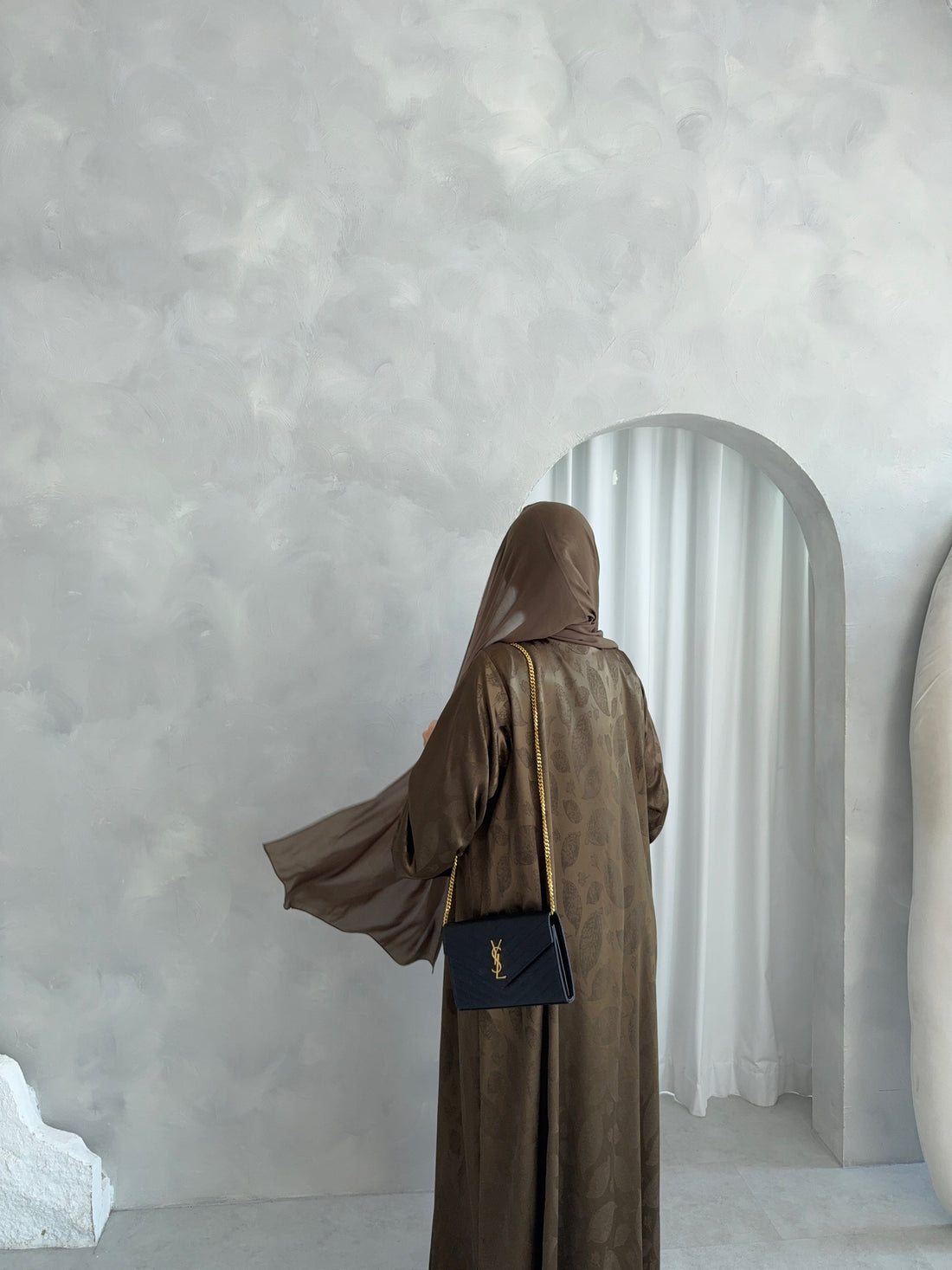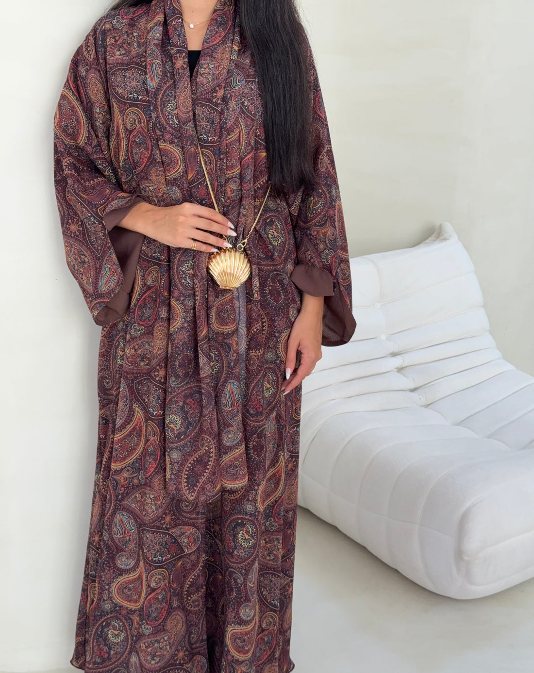 A timeless abaya crafted from premium Italian chiffon, featuring a subtle all-over print that adds...