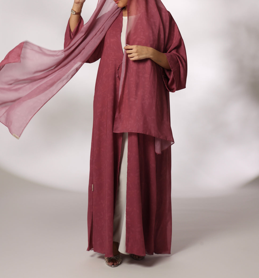 A sophisticated abaya crafted from premium Italian jacquard, featuring an elegant all-over print that...