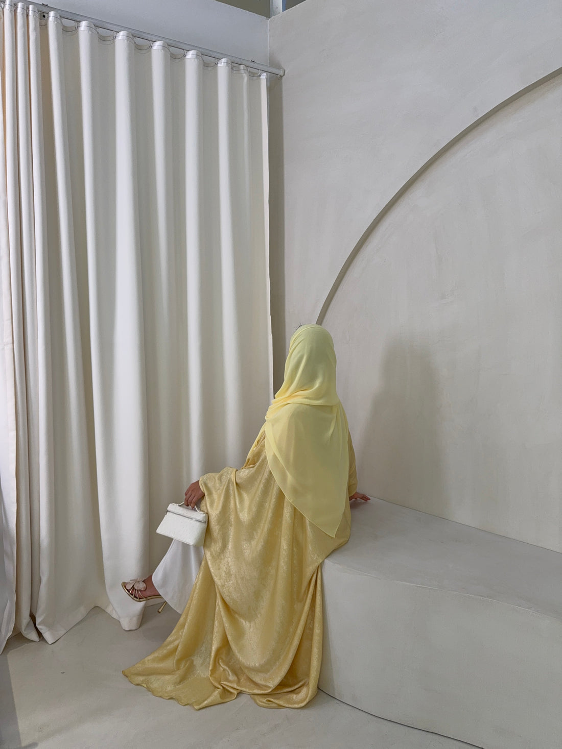 Luxury Emirati 'bisht' style abaya in butter yellow. It features a stunning golden shine that...