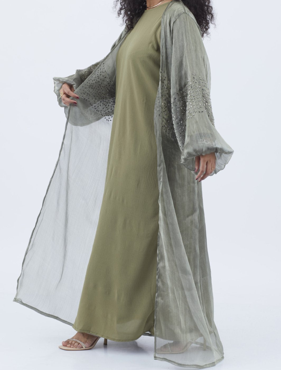 Luxury Emirati ‘bisht’ style abaya in an olive green shade. It features a stunning golden...