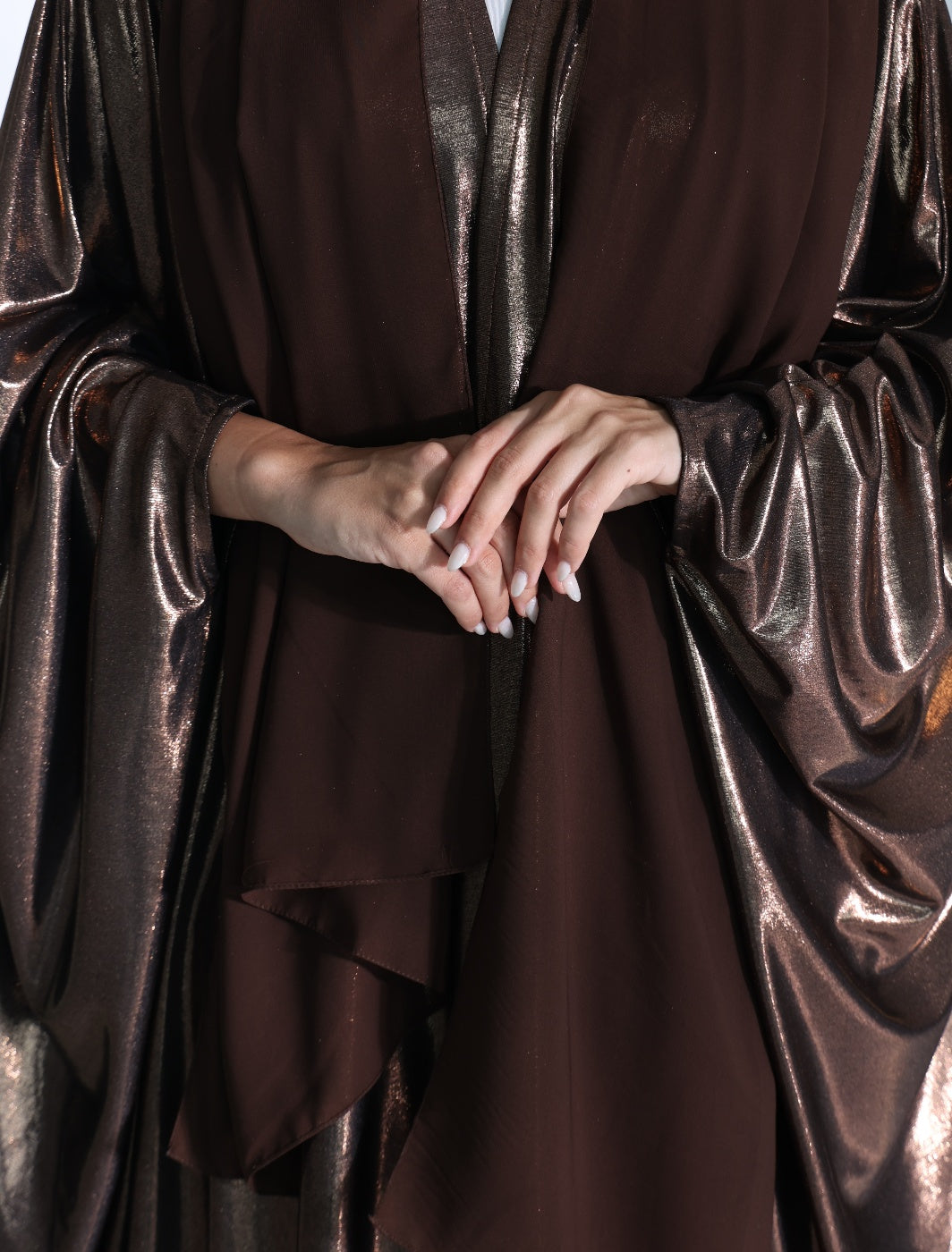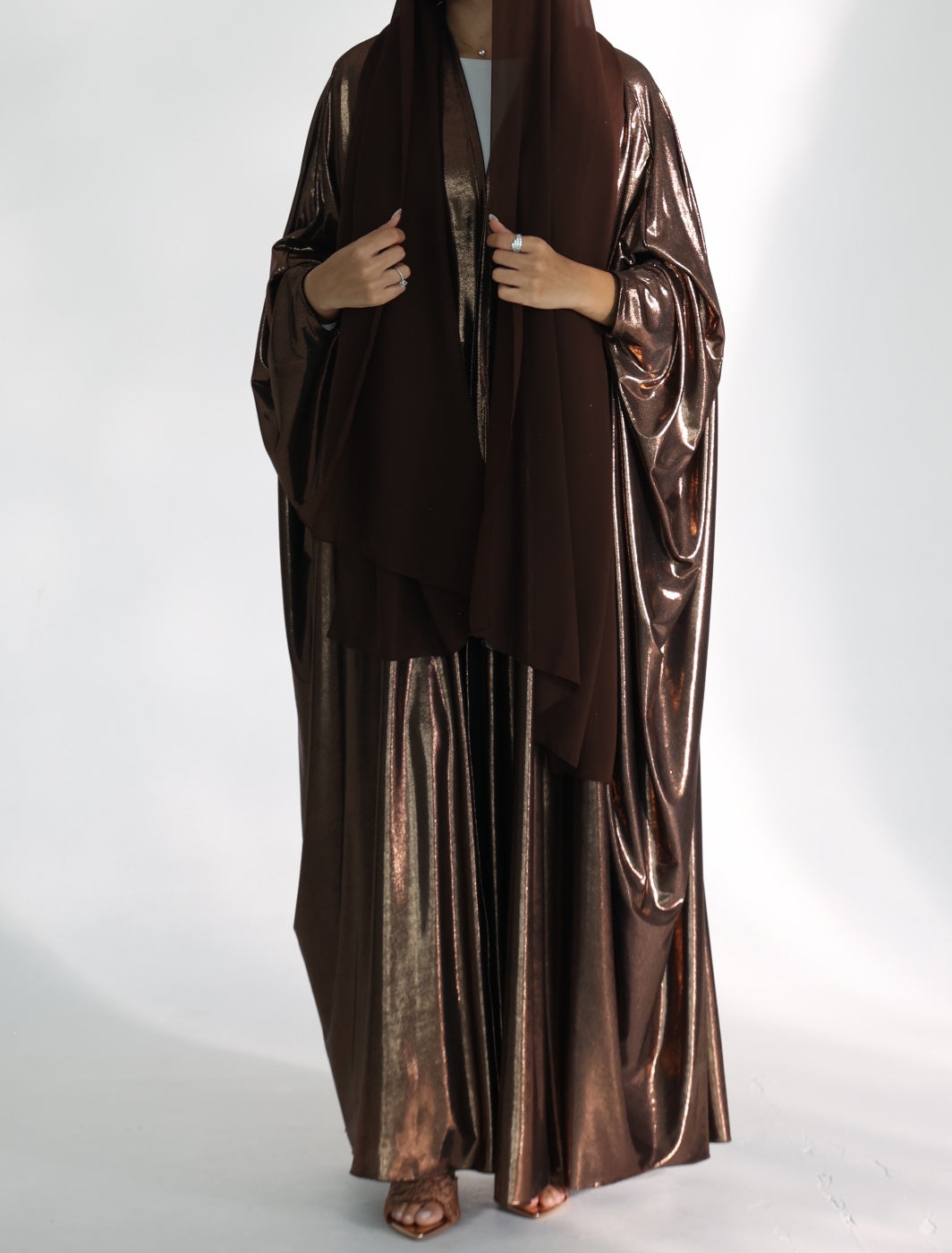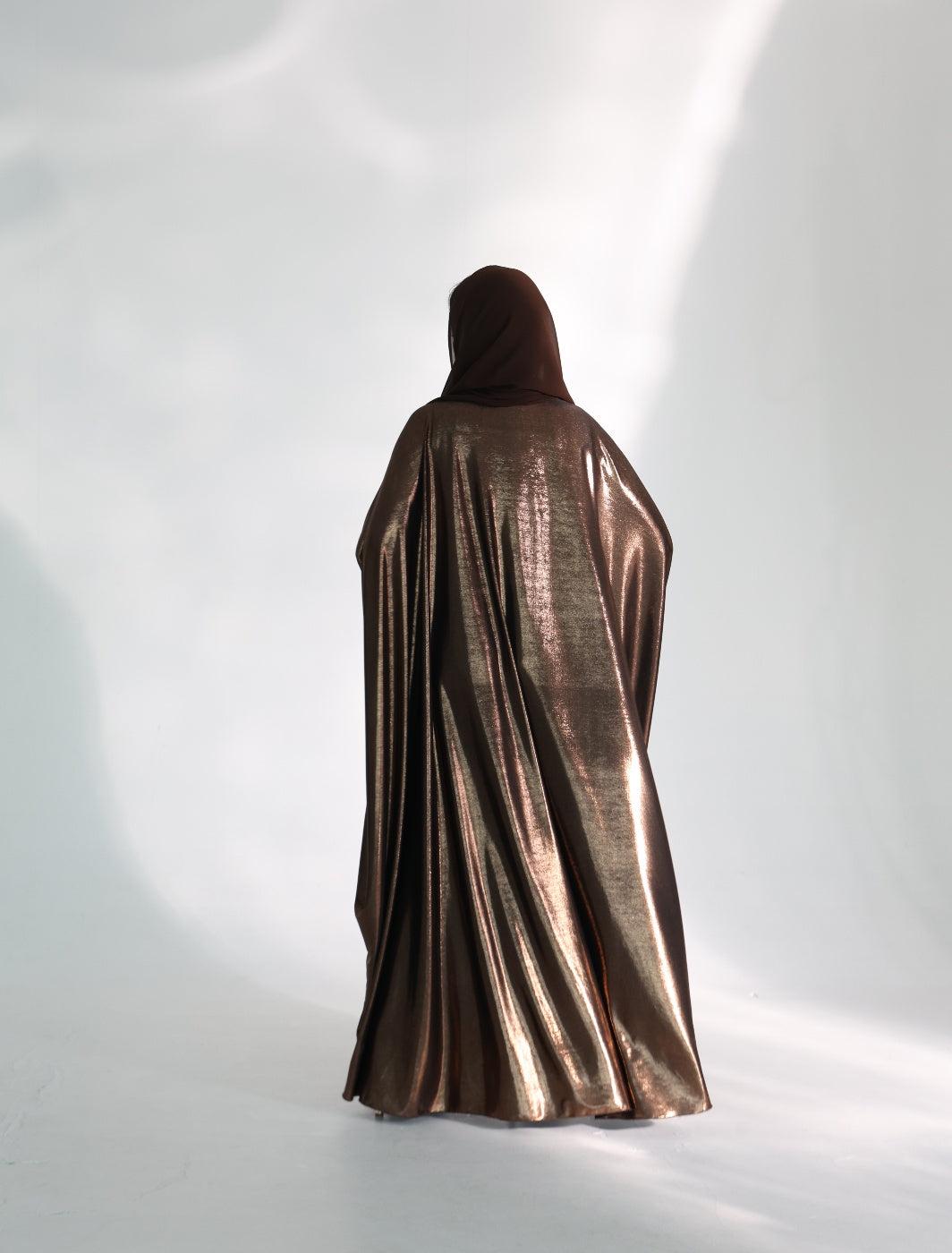 This bahraini-cut abaya is a statement of style and sophistication. Made from a fluid, metallic-finish fabric, its subtle shine makes it the centerpiece of any occasion. The design reflects the essence of traditional Gulf style, with a modern and enveloping twist. Perfect for those seeking a distinctive piece that combines modesty, elegance, and trendiness.