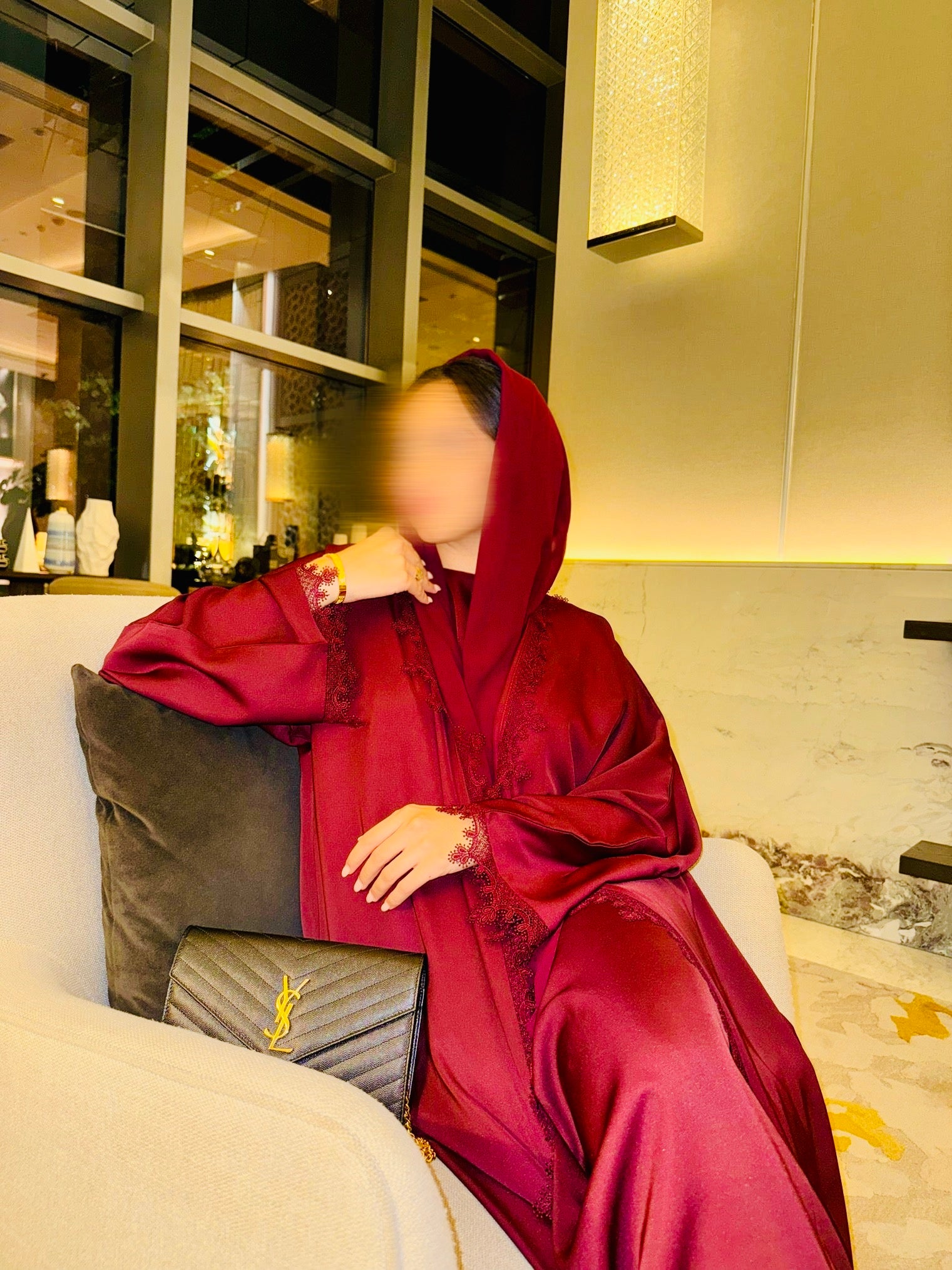 Elevate your style with this luxurious Emirati abaya, featuring delicate lace details on the sleeves and silhouette. A perfect blend of traditional craftsmanship and modern elegance, offering both comfort and sophistication for a timeless wardrobe addition.