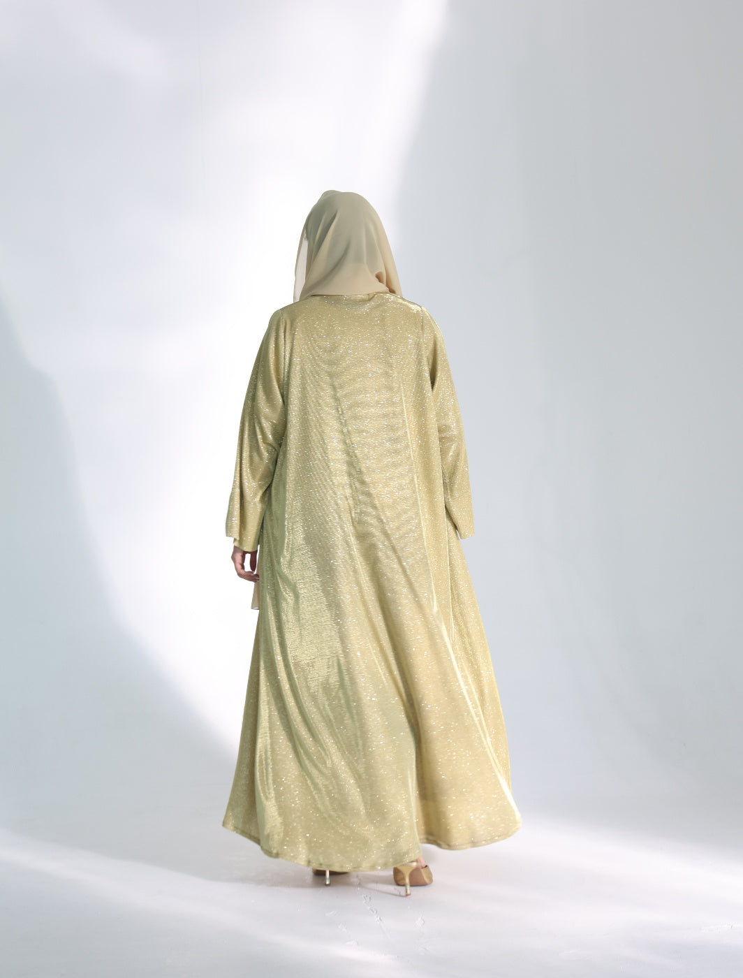 Shine in this abaya, designed to offer graceful movement, fluidity, and an elegant silhouette with every step. It includes a matching inner dress for added coverage and comfort, along with an extra-long scarf that can be styled in multiple ways. Perfect for special occasions or for those seeking a modest look with a contemporary, feminine touch.