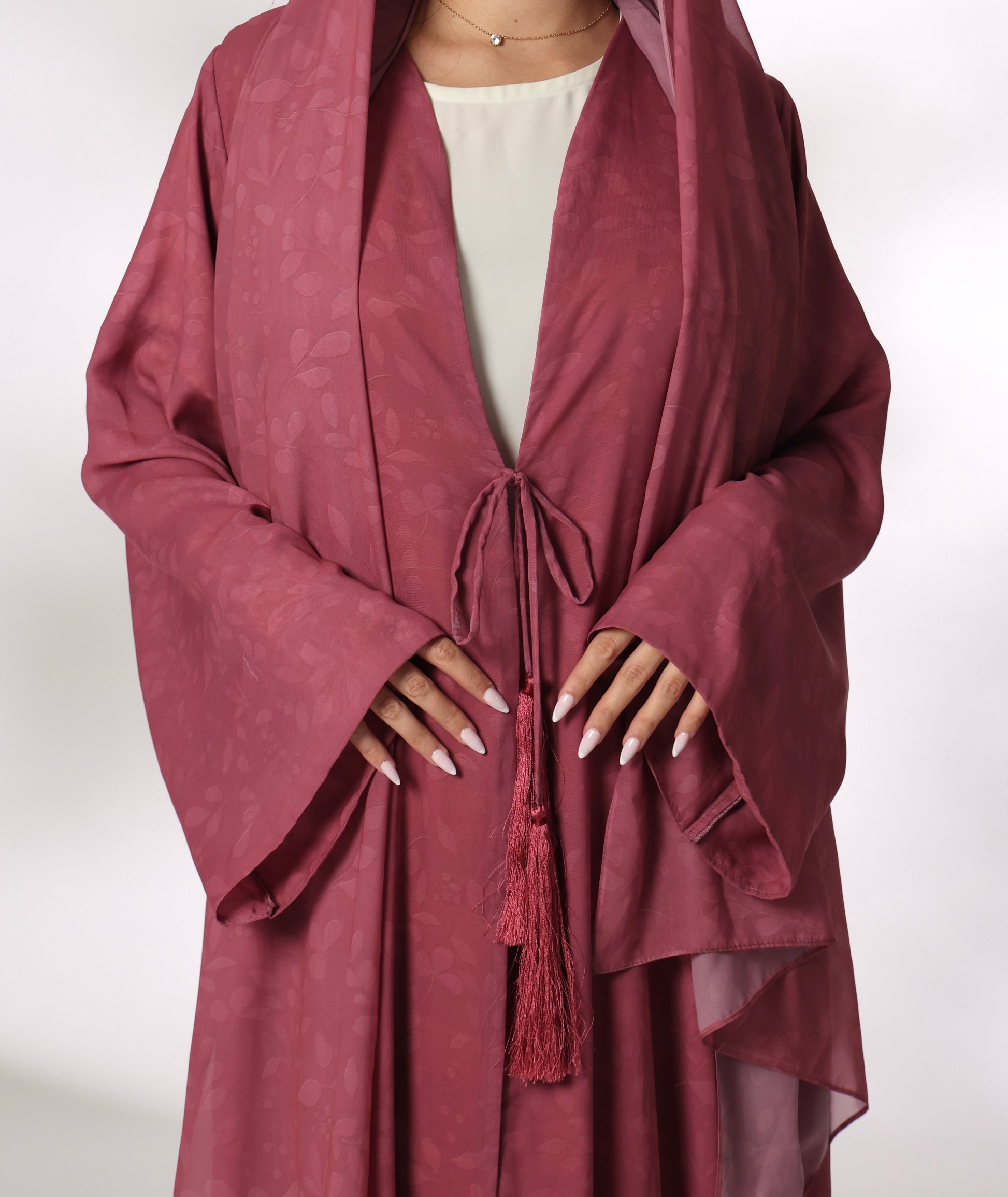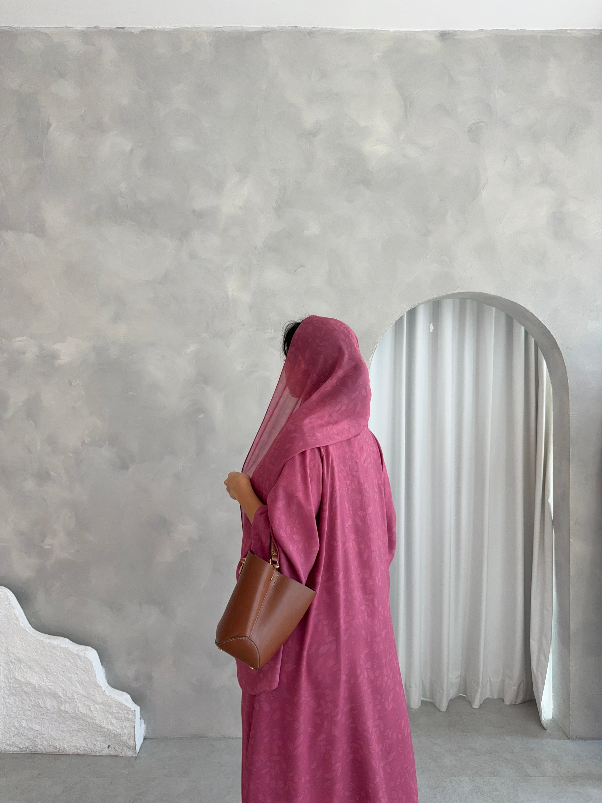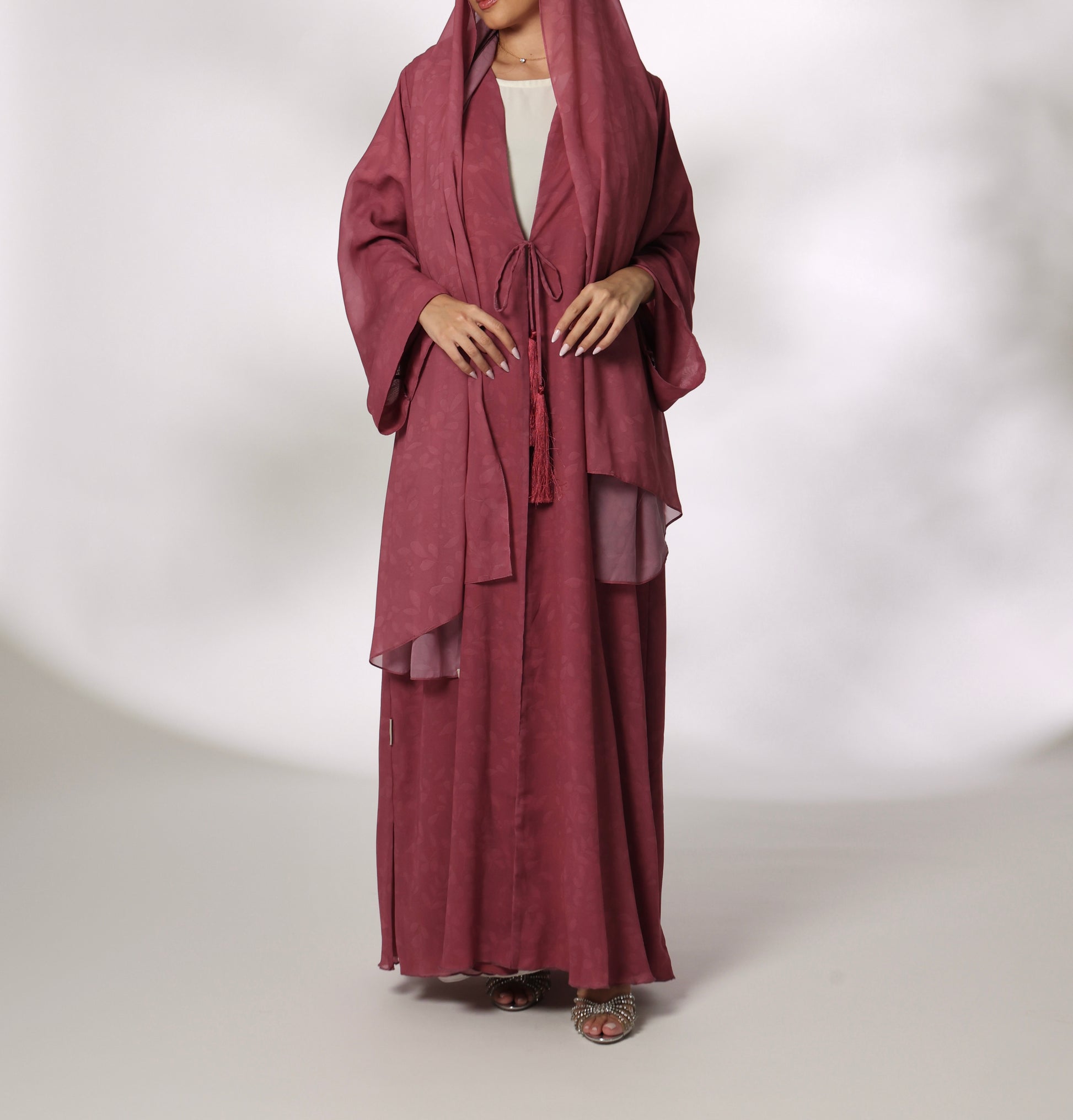 Discover timeless elegance in our muted rose abaya, crafted from sophisticated Italian premium chiffon. This double-layer design features a subtle tonal floral print that adds depth and sophistication. The front is adorned with a double tarboosh closure, adding a touch of tradition. Finished with a double tarboosh closure at the front, it carries a delicate touch of tradition. Discreet side slits enhance movement and fluidity, allowing the abaya to flow beautifully with every step. Graceful and lightweight, perfect for elevated everyday wear or special occasions.