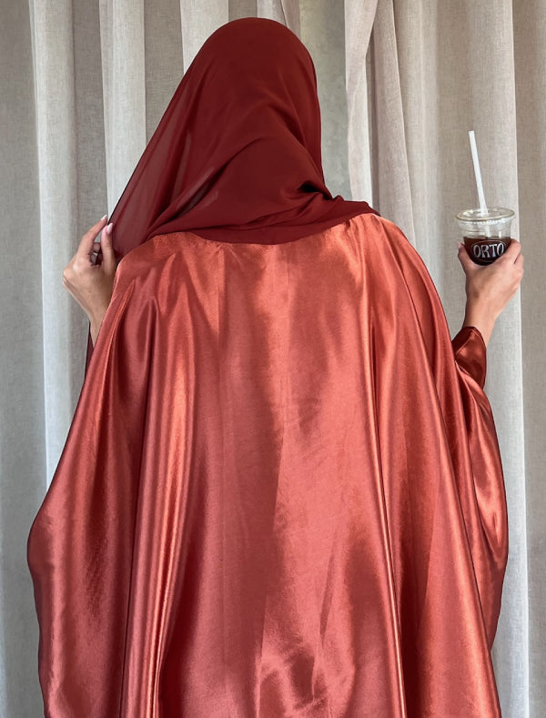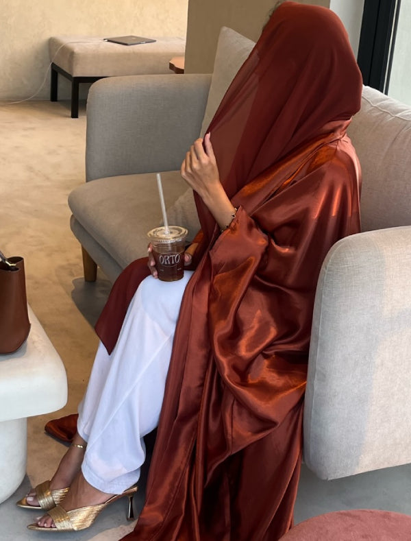 Redescubre el lujo emiratí con esta abaya de corte bahraini. Con un acabado metalizado, Ameera consigue combinar la modernidad y originalidad con la modestia. Déjate sorprender con el toque luminoso y cálido que este color marrón anaranjado brinda. Eleva tu outfit con esta única pieza diseñada exclusivamente por Nomad.