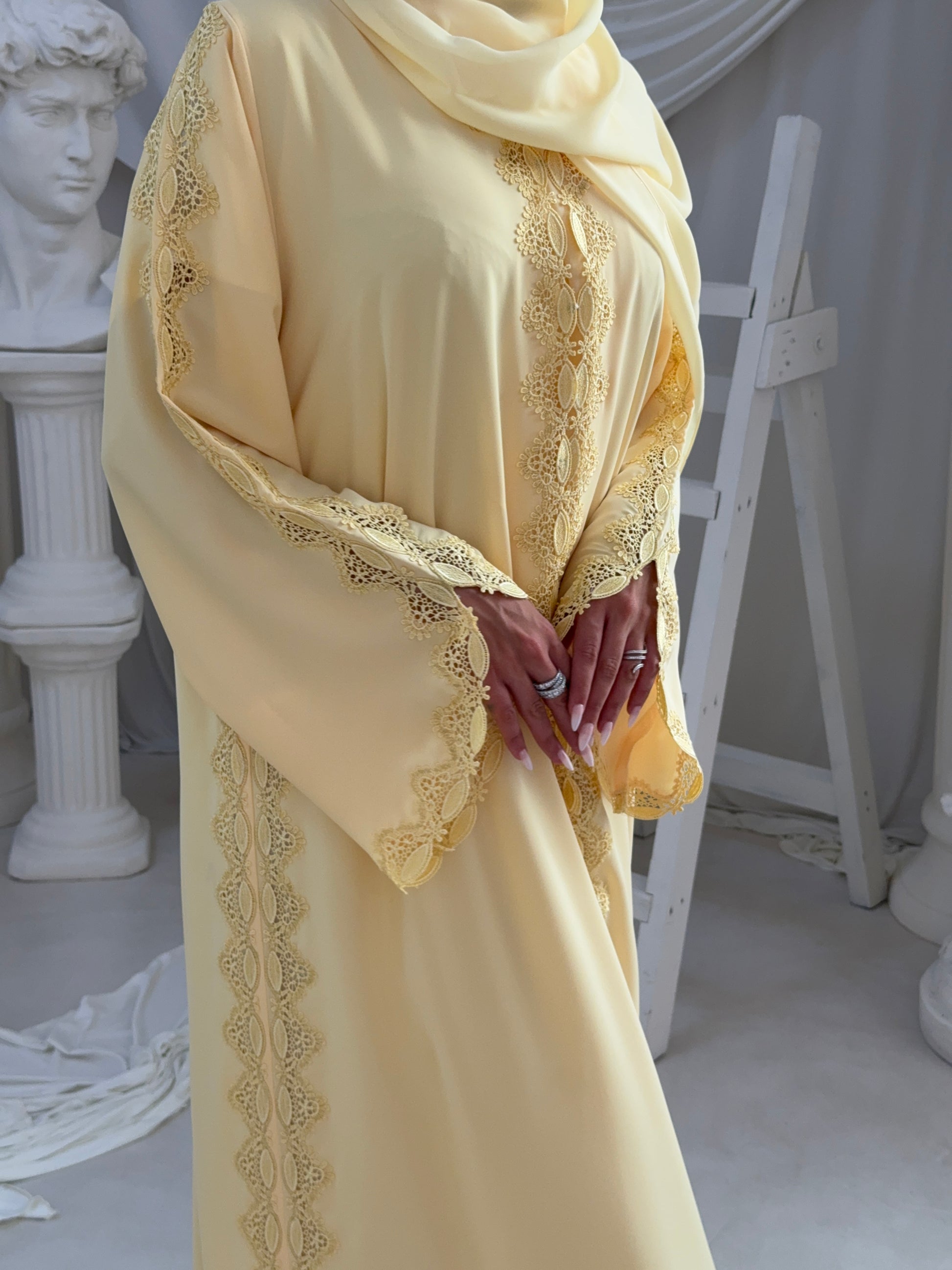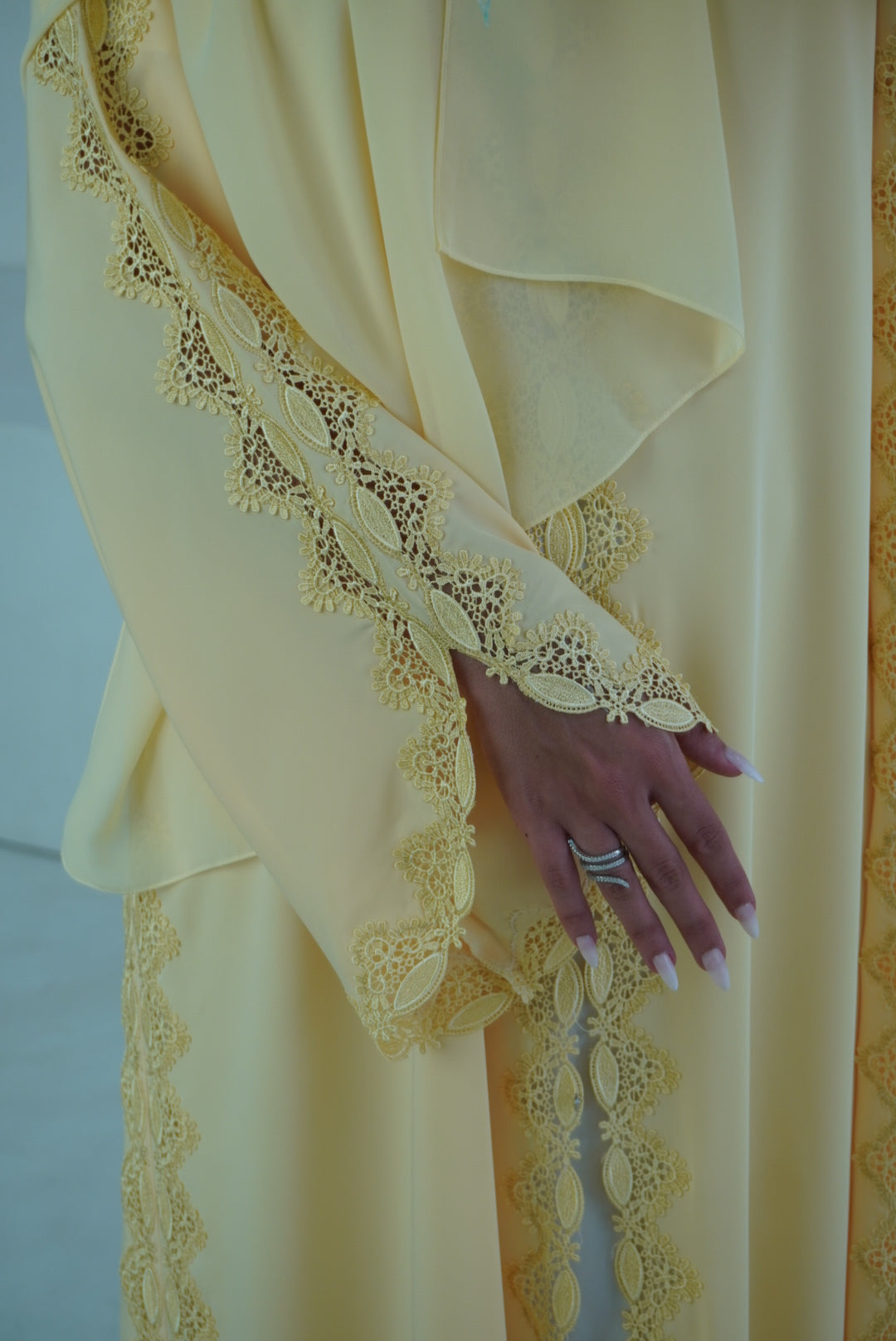 Immerse yourself in the essence of true luxury with this couture abaya. Exquisite lace adorns its length, accentuating every line with precision and timeless elegance.