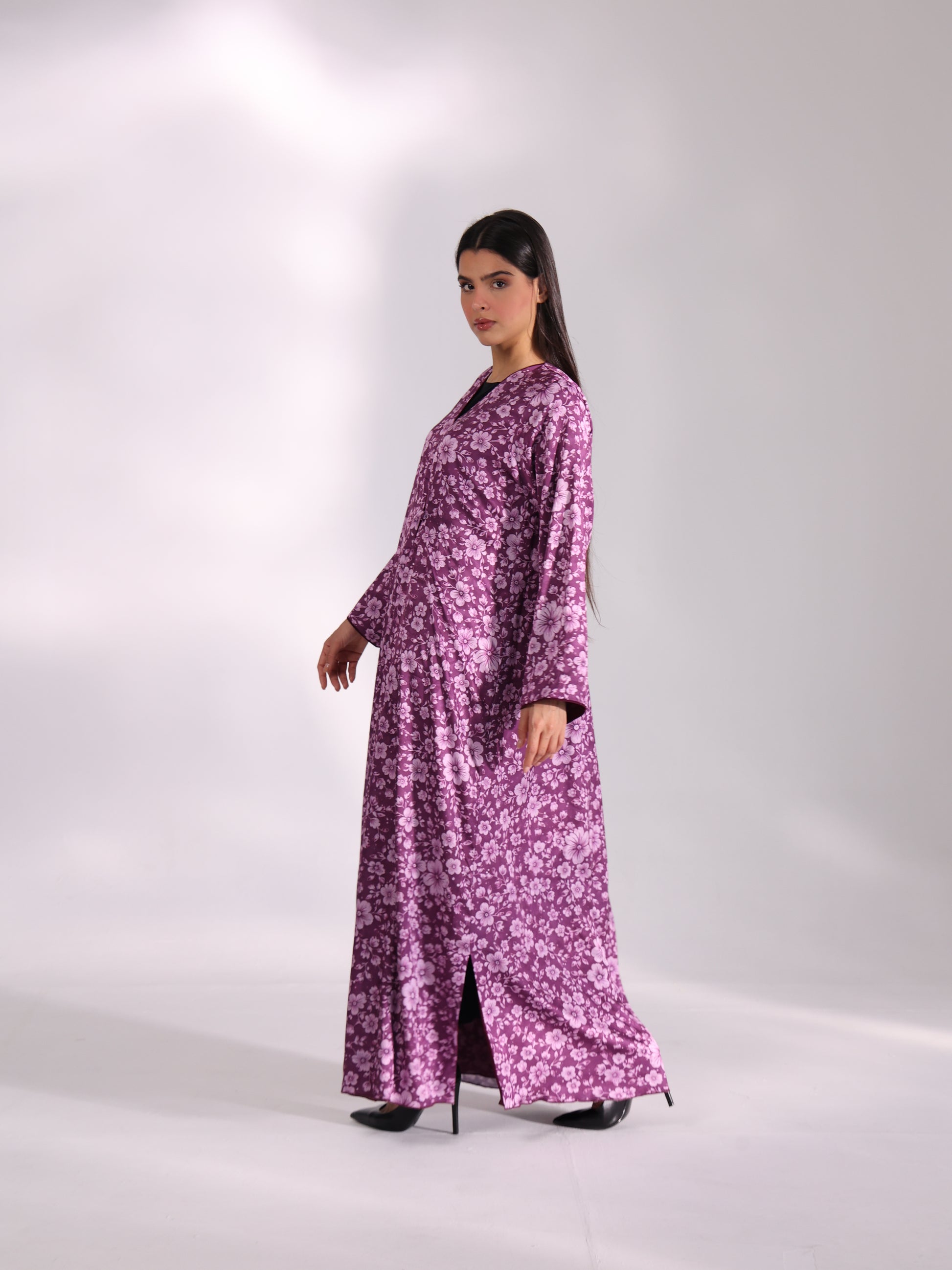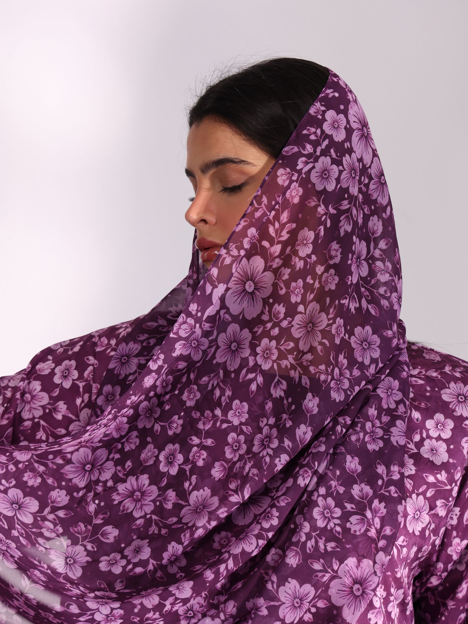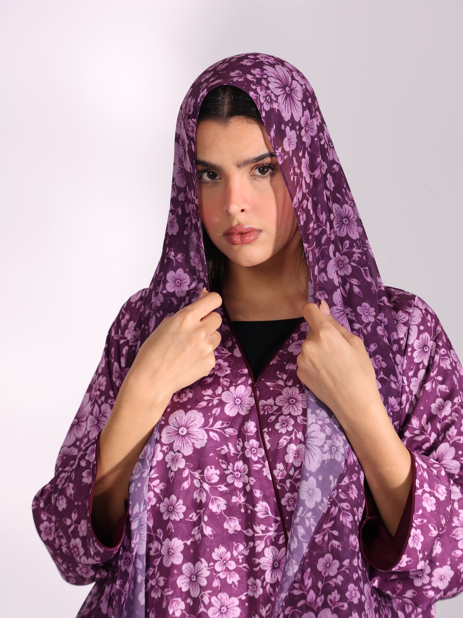 This abaya is a tribute to refined femininity. Crafted from sophisticated Italian jacquard in a rich purple floral pattern, this abaya embodies grace, confidence, and quiet strength.