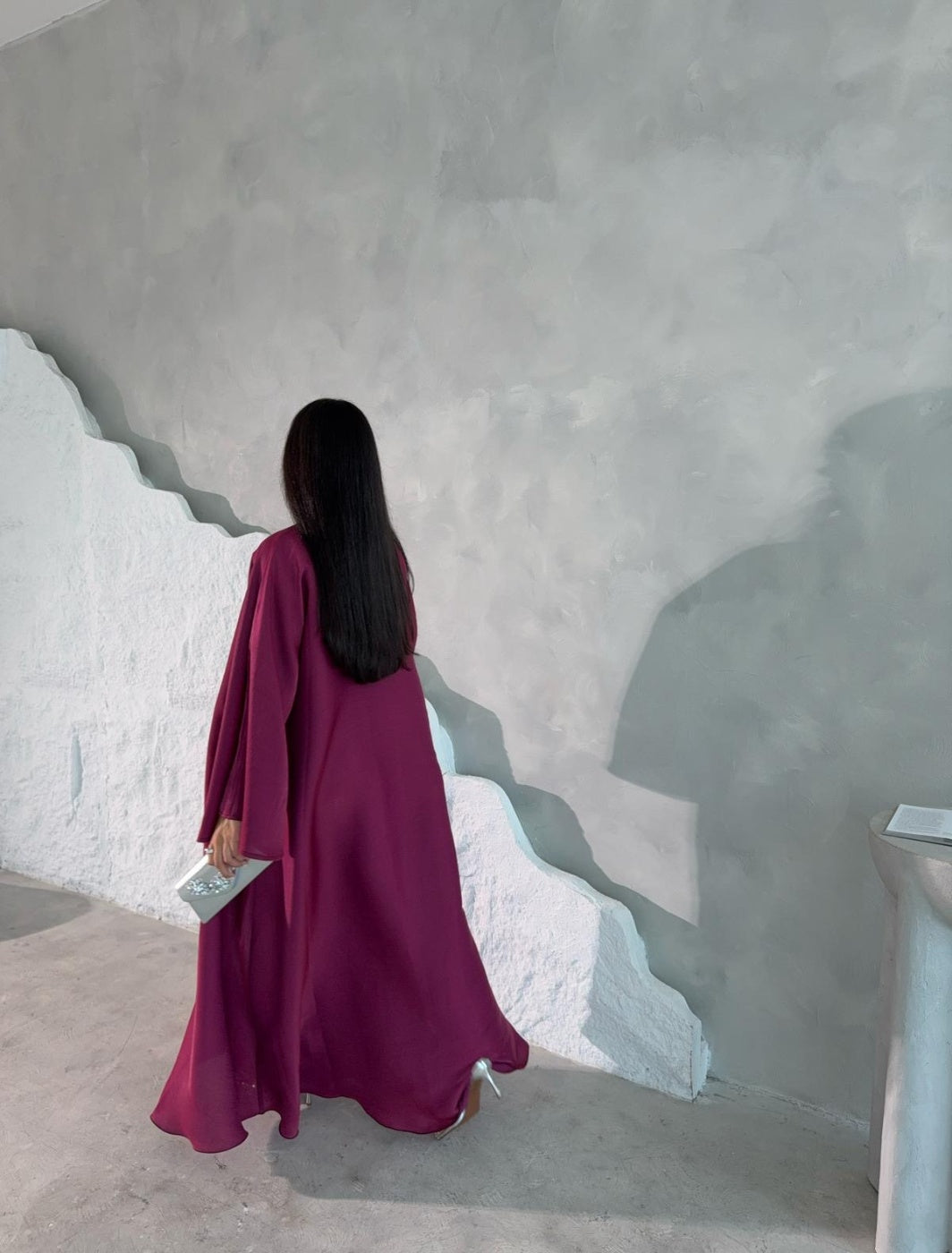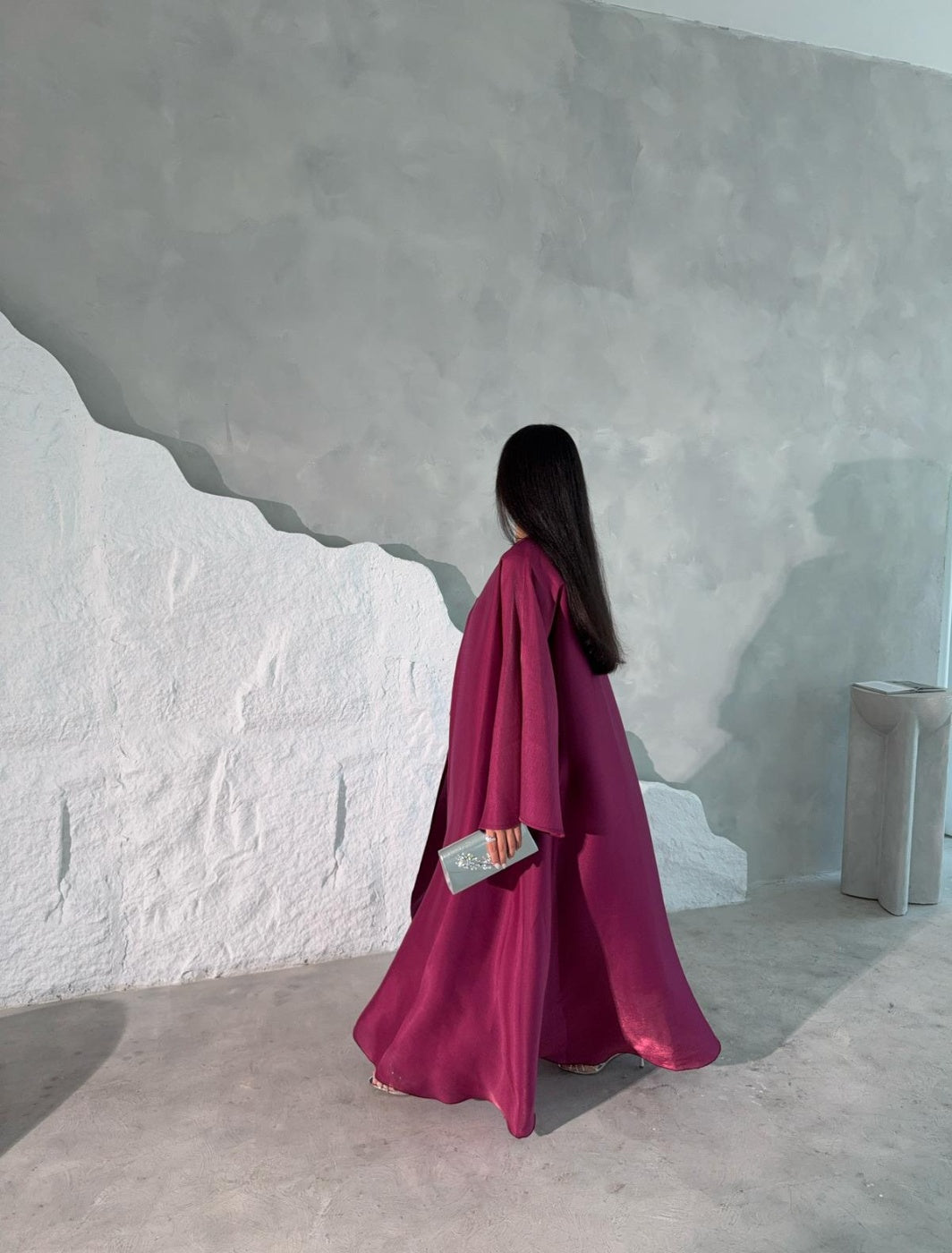 Shine in this umbrella-cut abaya, designed to offer graceful movement, fluidity, and an elegant silhouette with every step. Crafted in a vibrant fuchsia hue, this piece stands out with its wide sleeves and flowing shape, creating a light and airy effect. It includes a matching inner dress for added coverage and comfort, along with an extra-long scarf that can be styled in multiple ways. Perfect for special occasions or for those seeking a modest look with a contemporary, feminine touch.