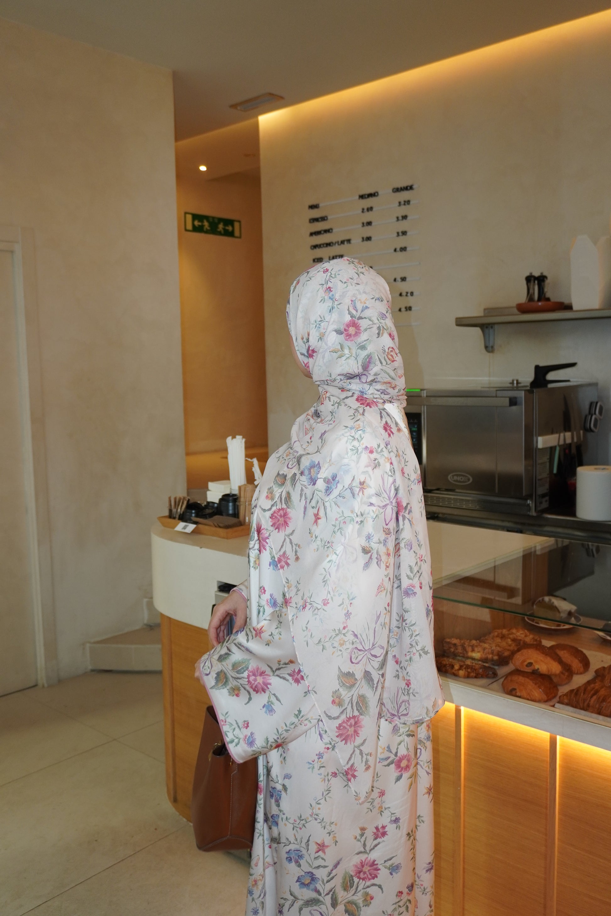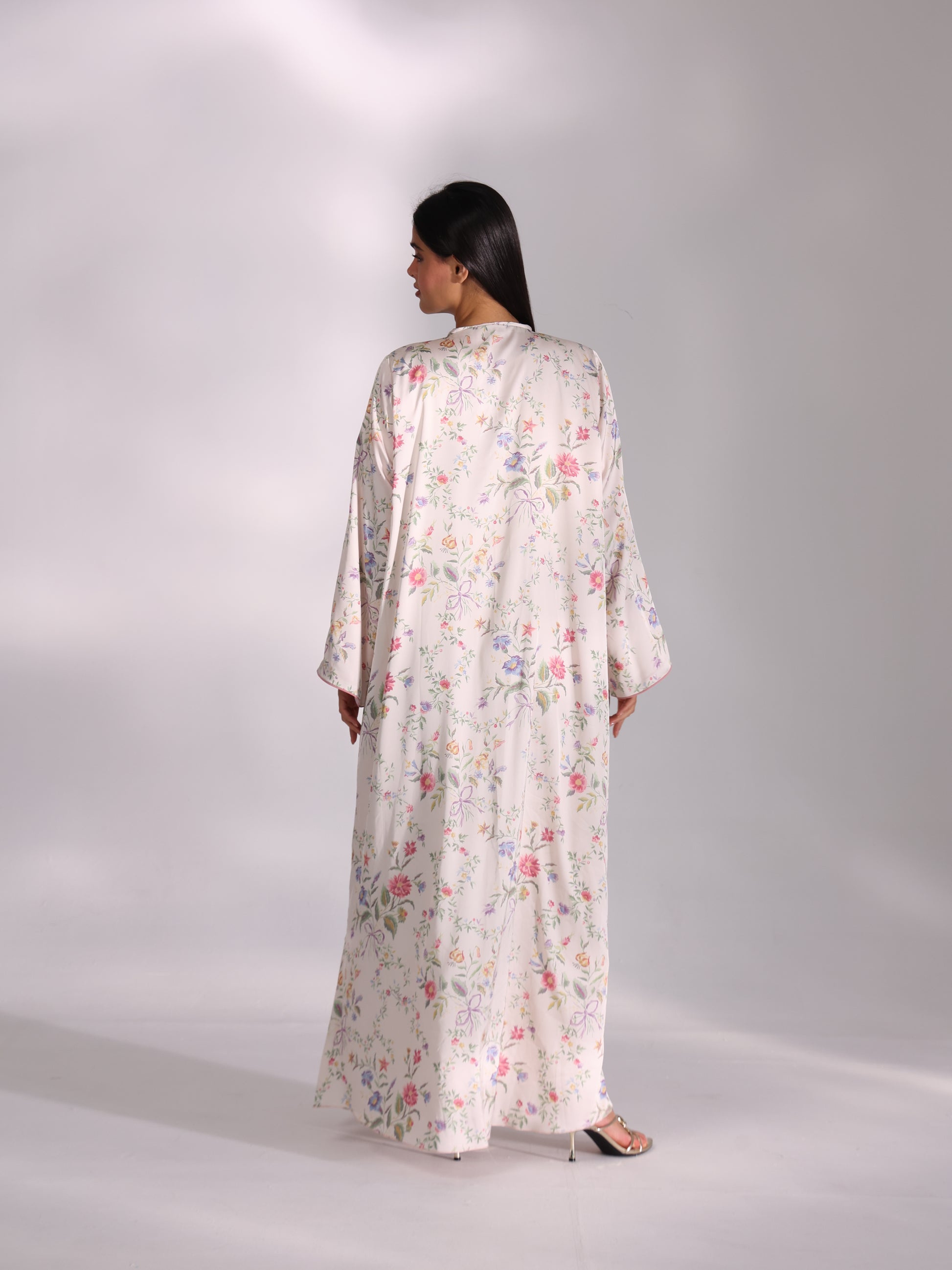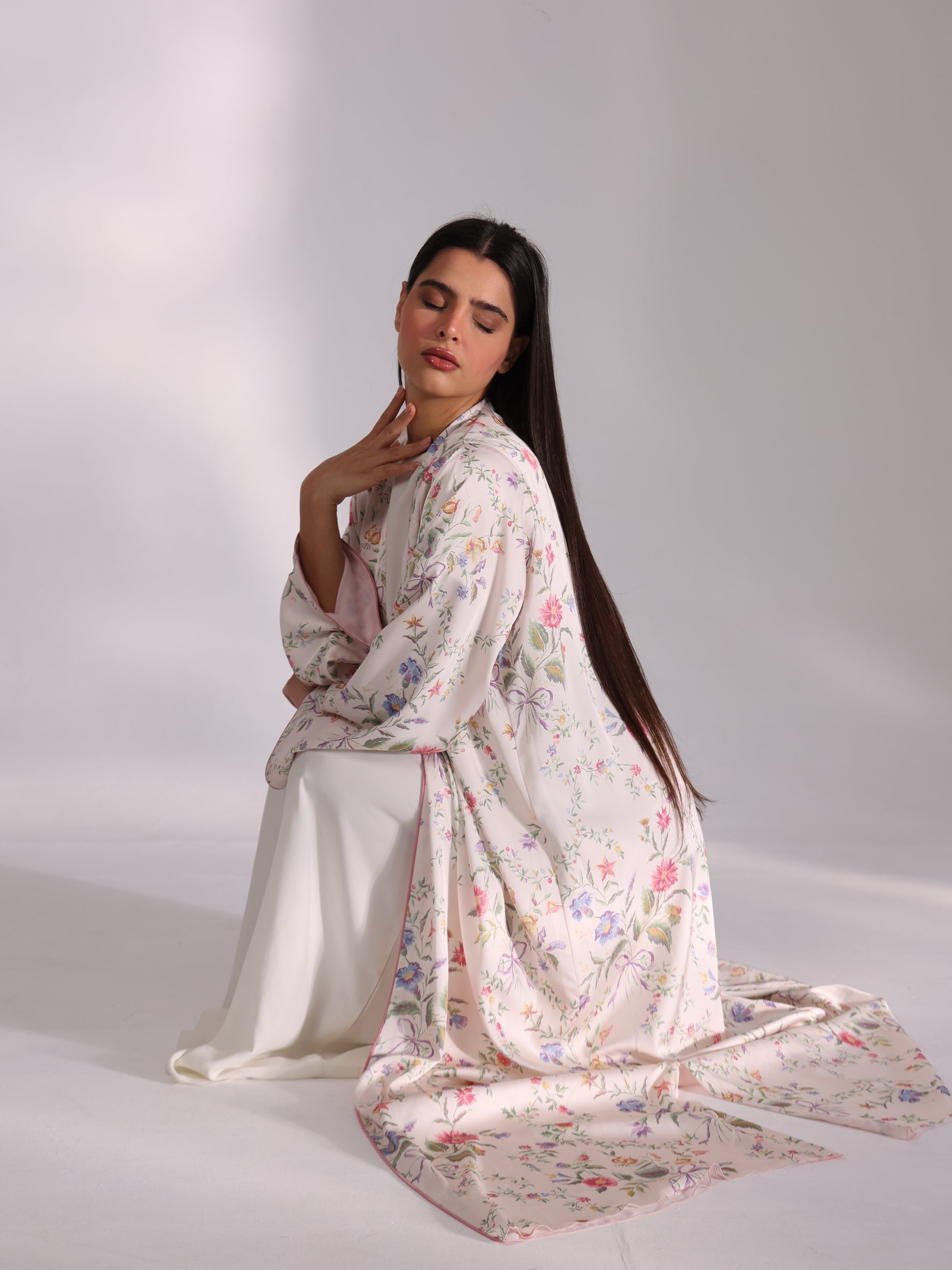 A delicate and feminine abaya in Italian satin with a floral and ribbon-inspired print. It features a crossover front with a single button closure and side slits, creating graceful movement.