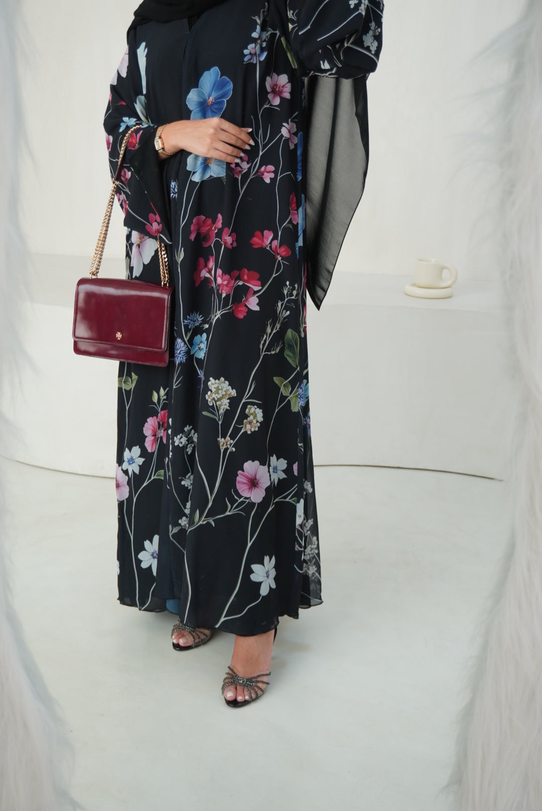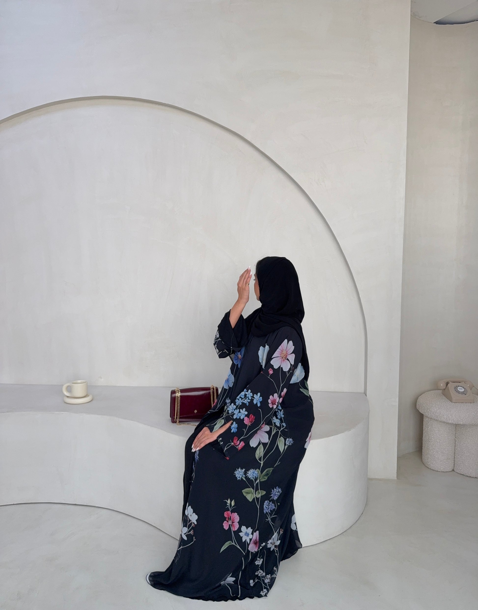 This black couture abaya showcases true sophistication. Elegant floral accents are carefully placed along the silhouette, highlighting delicate craftsmanship and refined detail. The deep black fabric beautifully contrasts with the floral designs, balancing strength with femininity.
