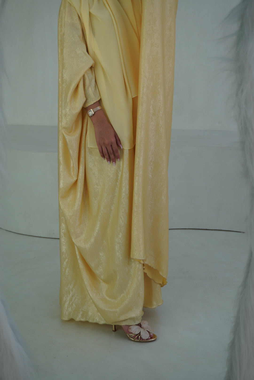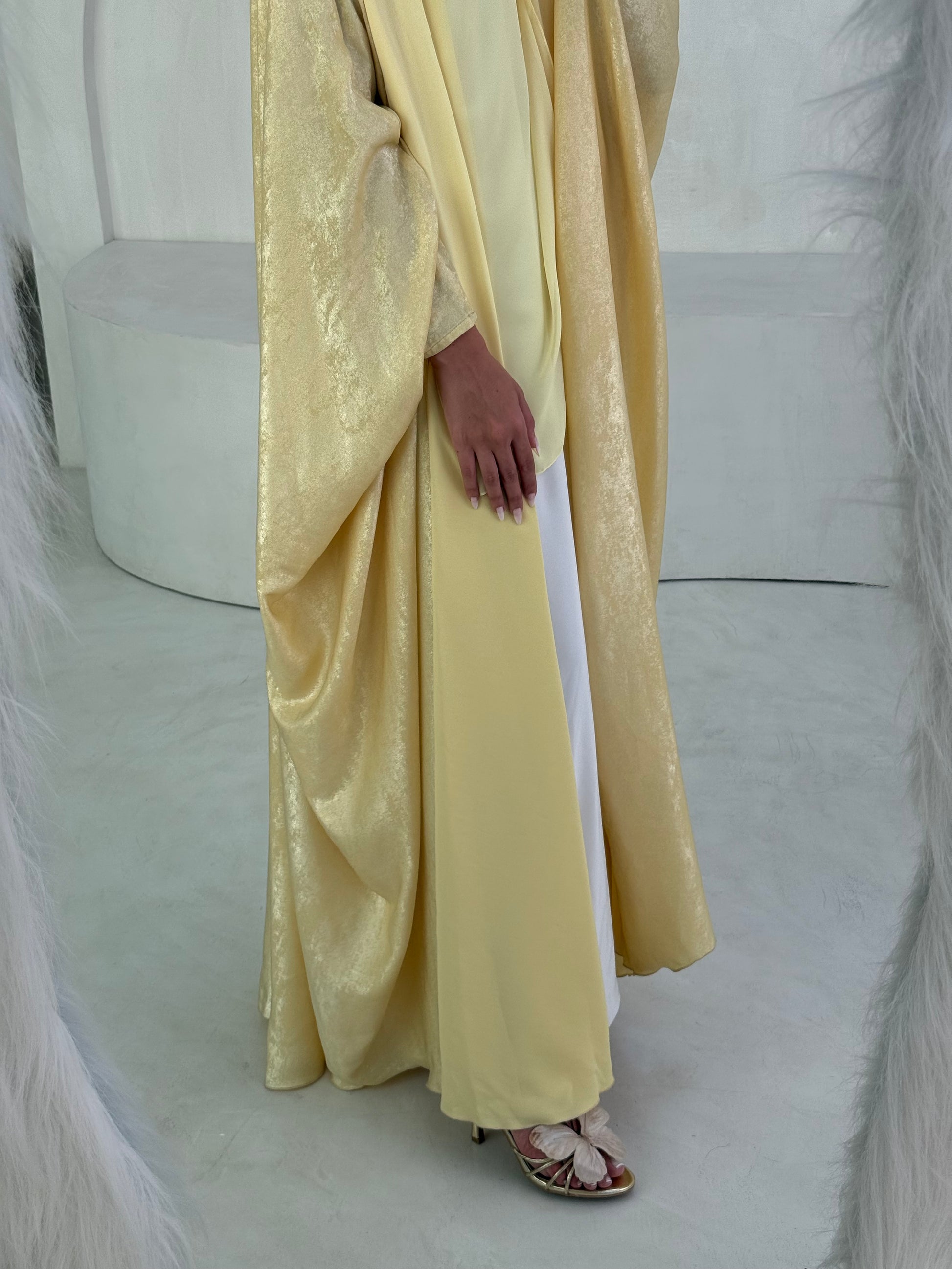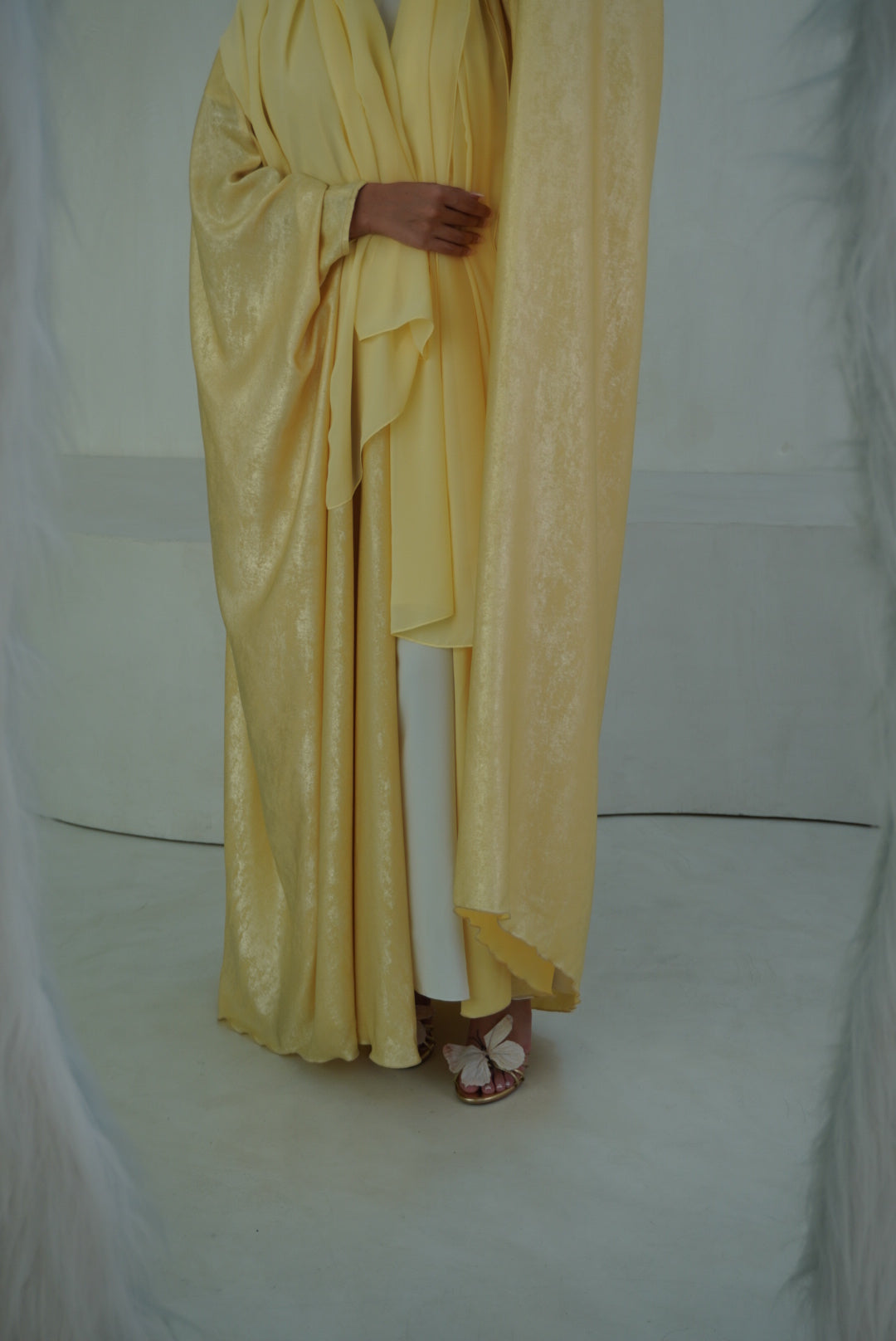 Luxury Emirati 'bisht' style abaya in butter yellow. It features a stunning golden shine that contrasts beautifully with the yellow.
