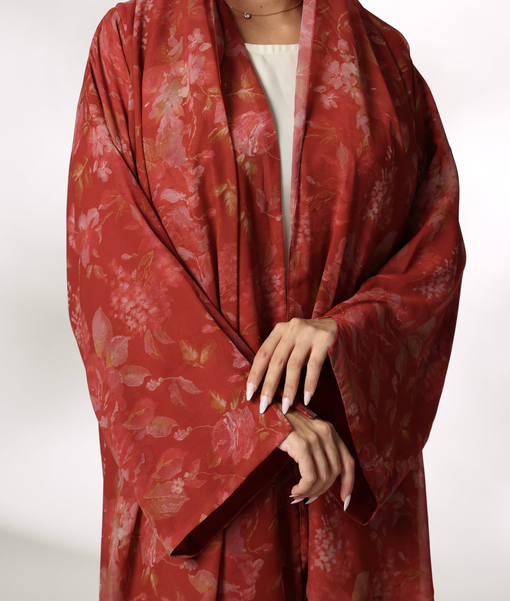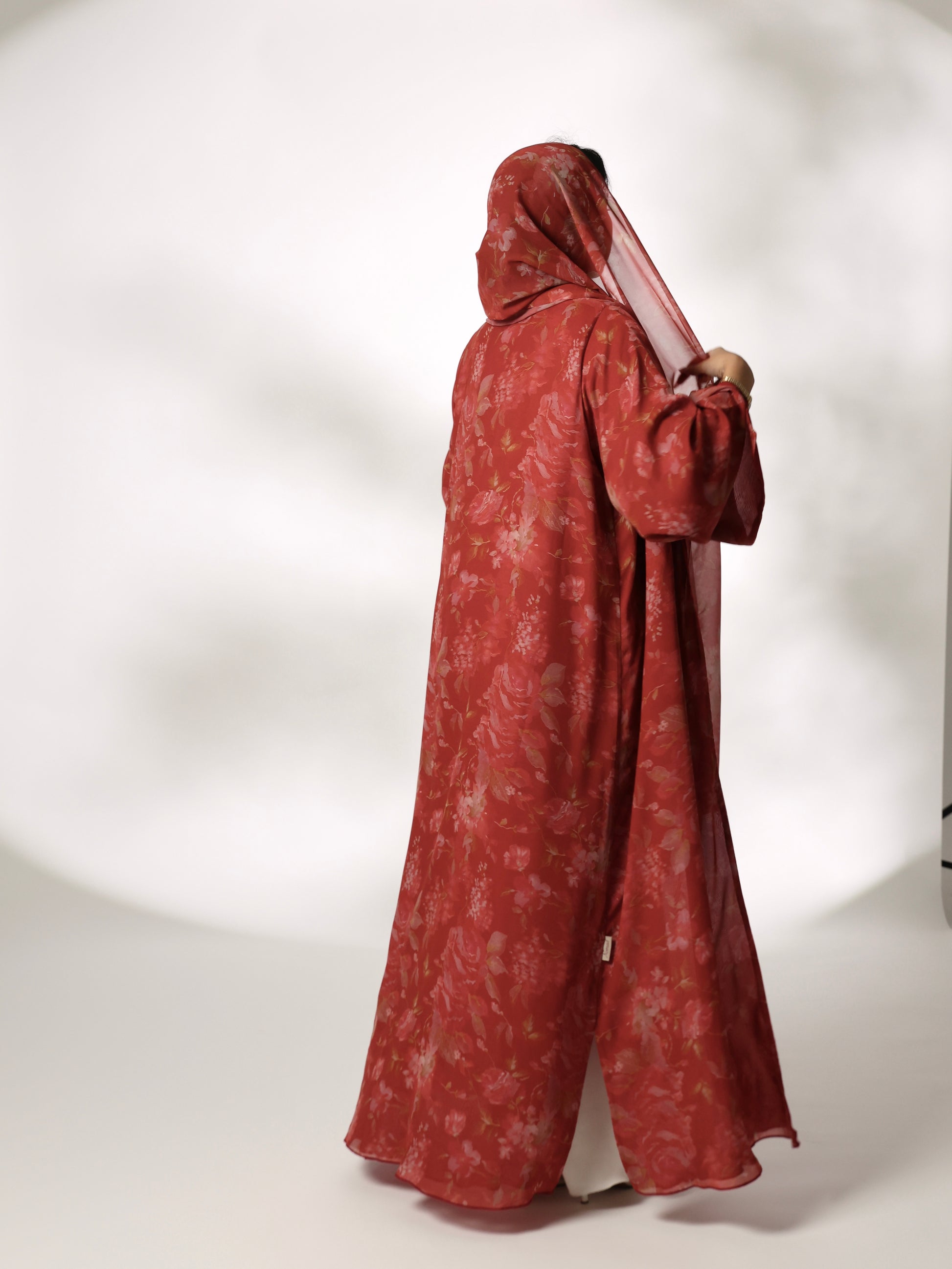 A stunning hibiscus-colored abaya in a bold red-orange hue, made from lightweight premium Italian chiffon. It features a delicate, subtle floral print that adds a touch of sophistication without overpowering the vibrant color. The rich tone highlights femininity, making this abaya a perfect choice for those who want to stand out with elegance and grace.