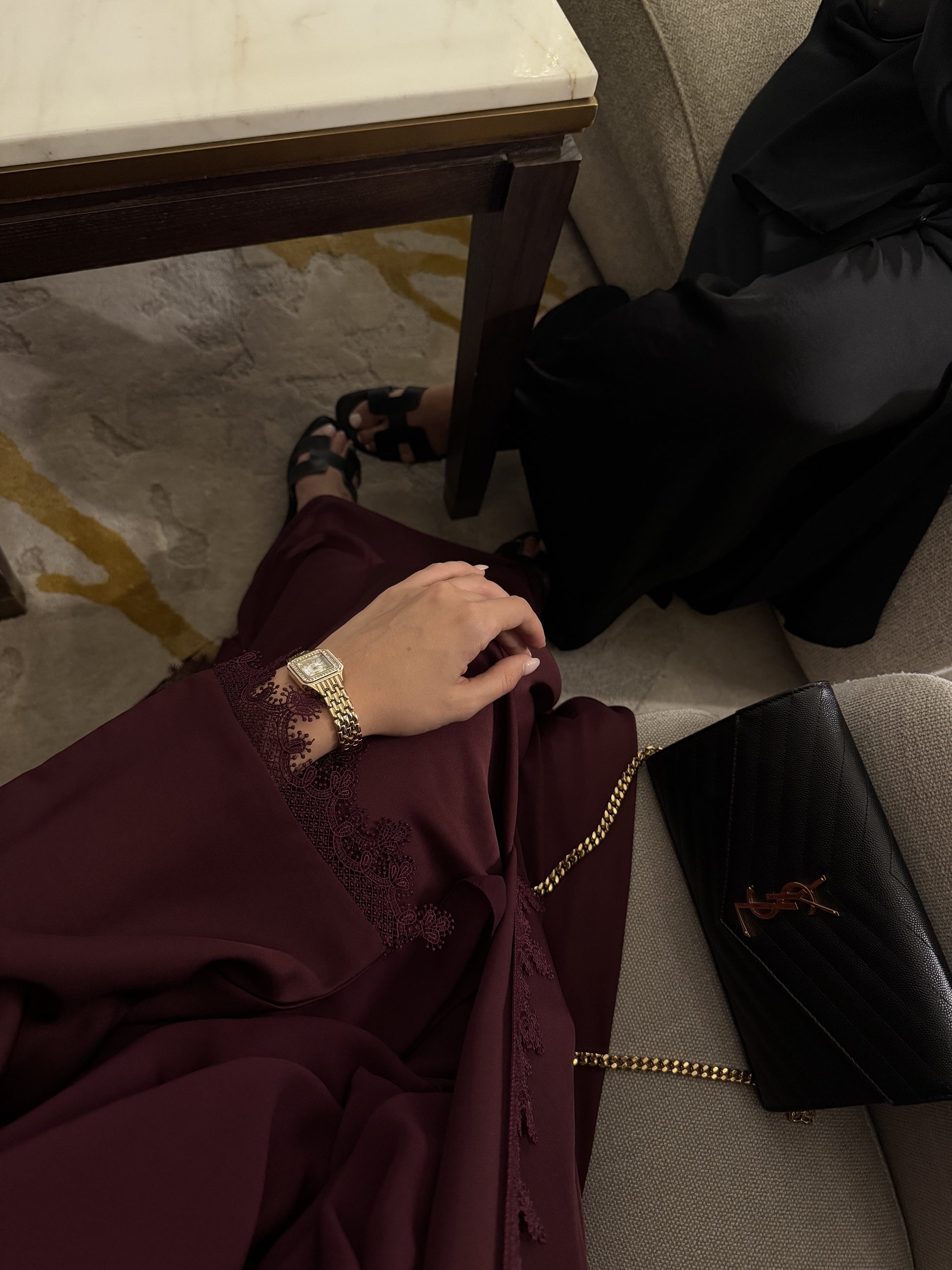 Elevate your style with this luxurious Emirati abaya, featuring delicate lace details on the sleeves and silhouette. A perfect blend of traditional craftsmanship and modern elegance, offering both comfort and sophistication for a timeless wardrobe addition.