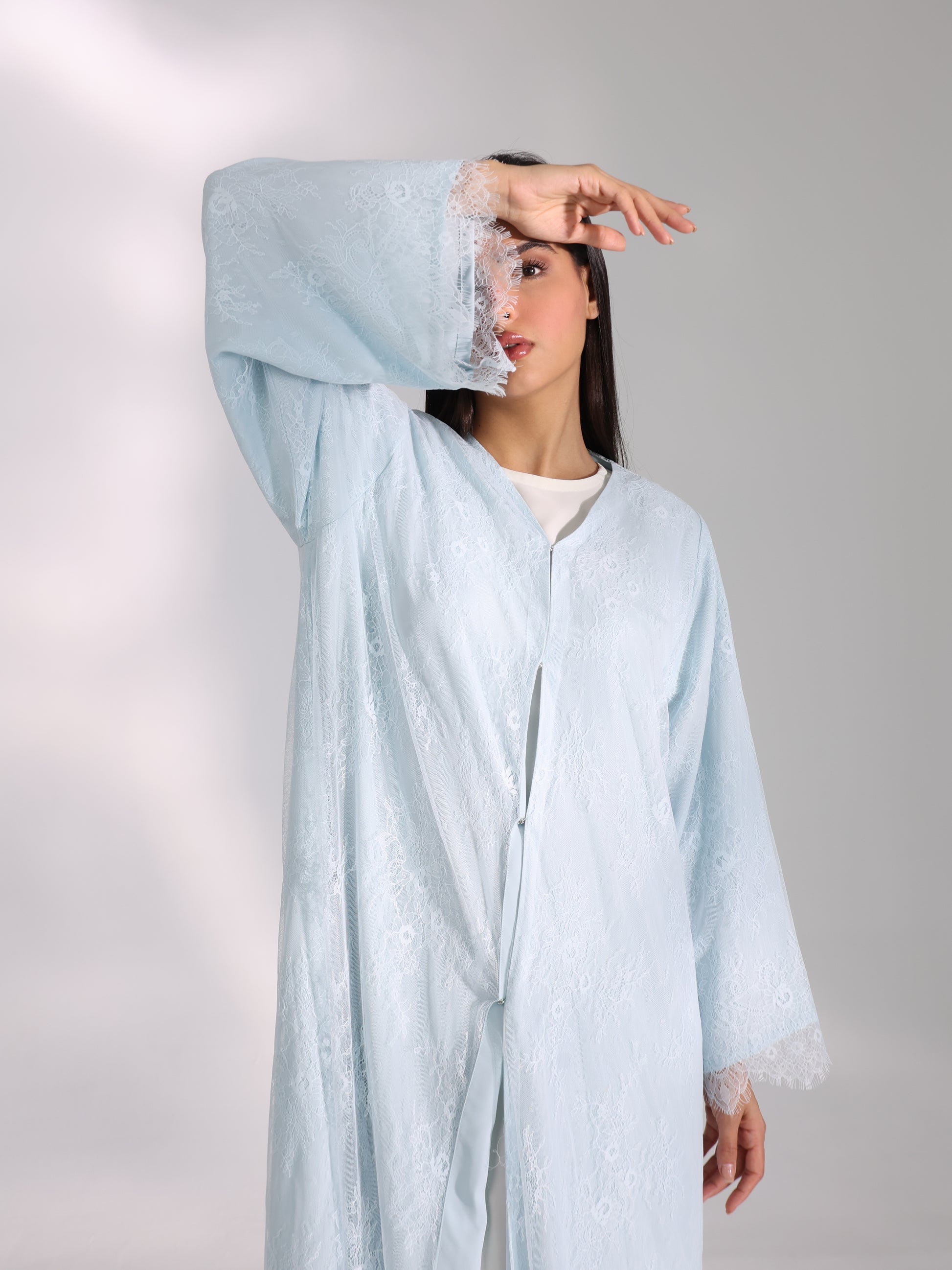 This elegant abaya comes in a rich blue teal shade that feels regal and sophisticated. Delicate lace details cover the entire piece, adding refined texture and femininity.