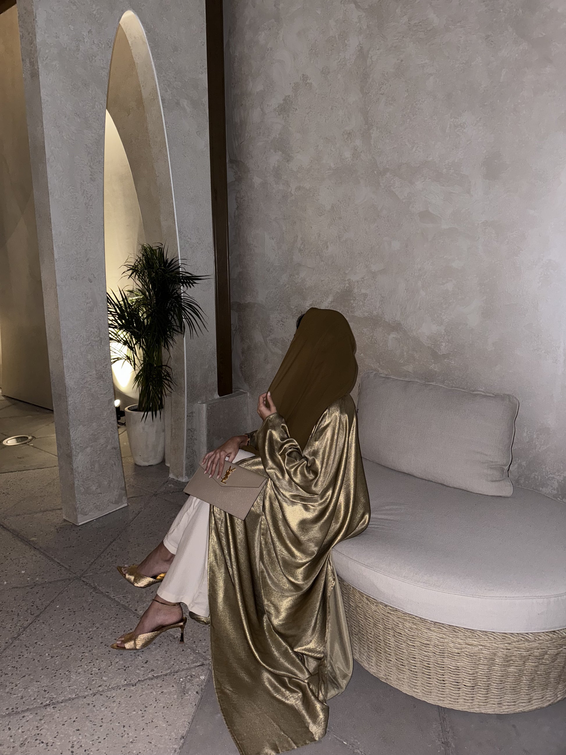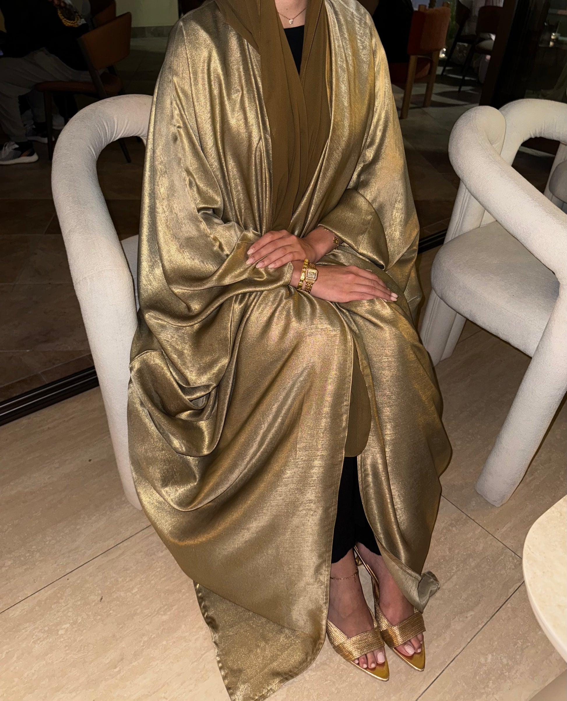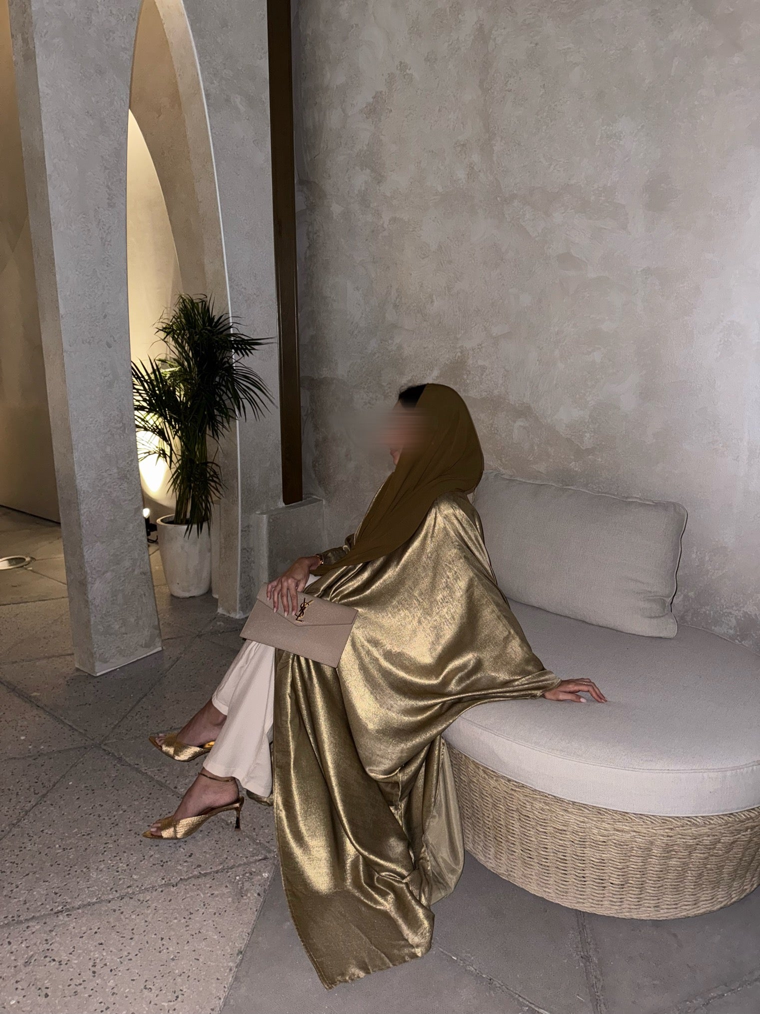 Elegant Emirati ‘bisht’ style abaya in a rich olive green hue. The fabric shimmers with a golden sheen, creating a striking contrast with the green for a luxurious velvet-like effect. Crafted from lightweight material, the abaya flows gracefully with every movement.