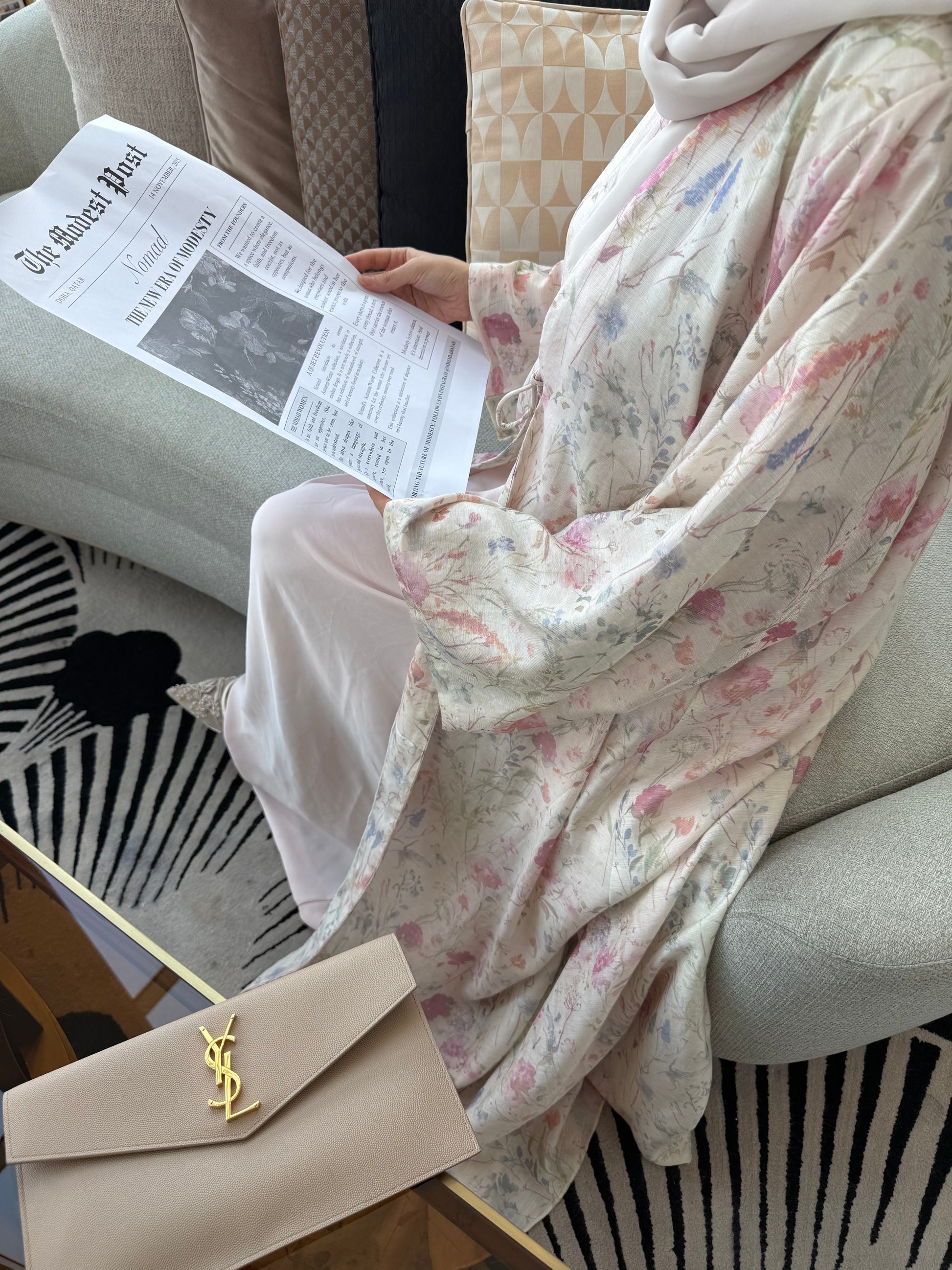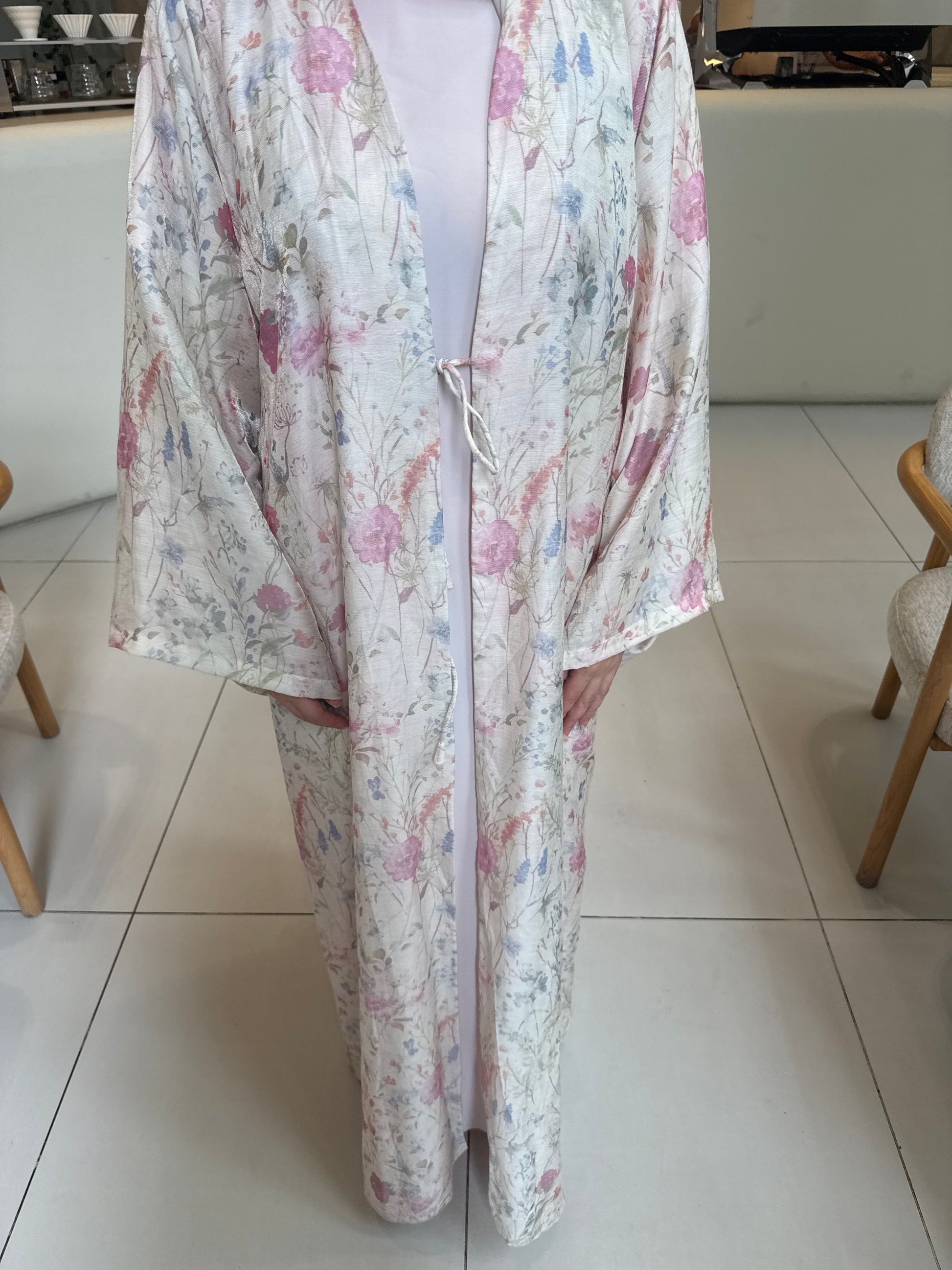 A very delicate white floral abaya, crafted from a luxurious cotton-organza blend that drapes gracefully while offering subtle structure. Its lightweight texture ensures comfort and elegance, perfect for both everyday wear and special occasions. The abaya comes with a matching plain hijab to complete the look with understated sophistication.
