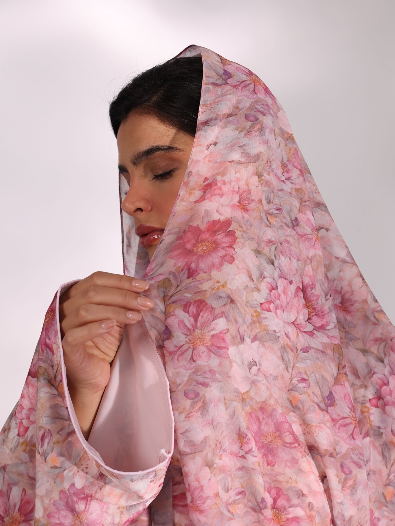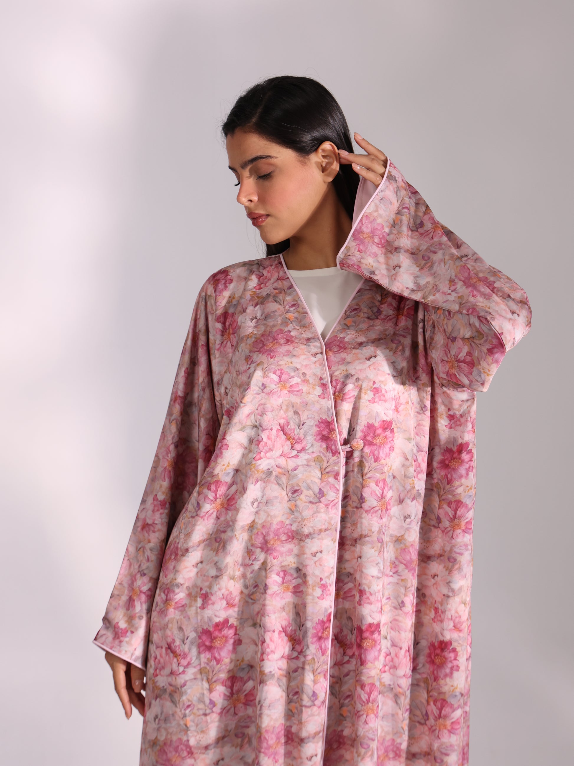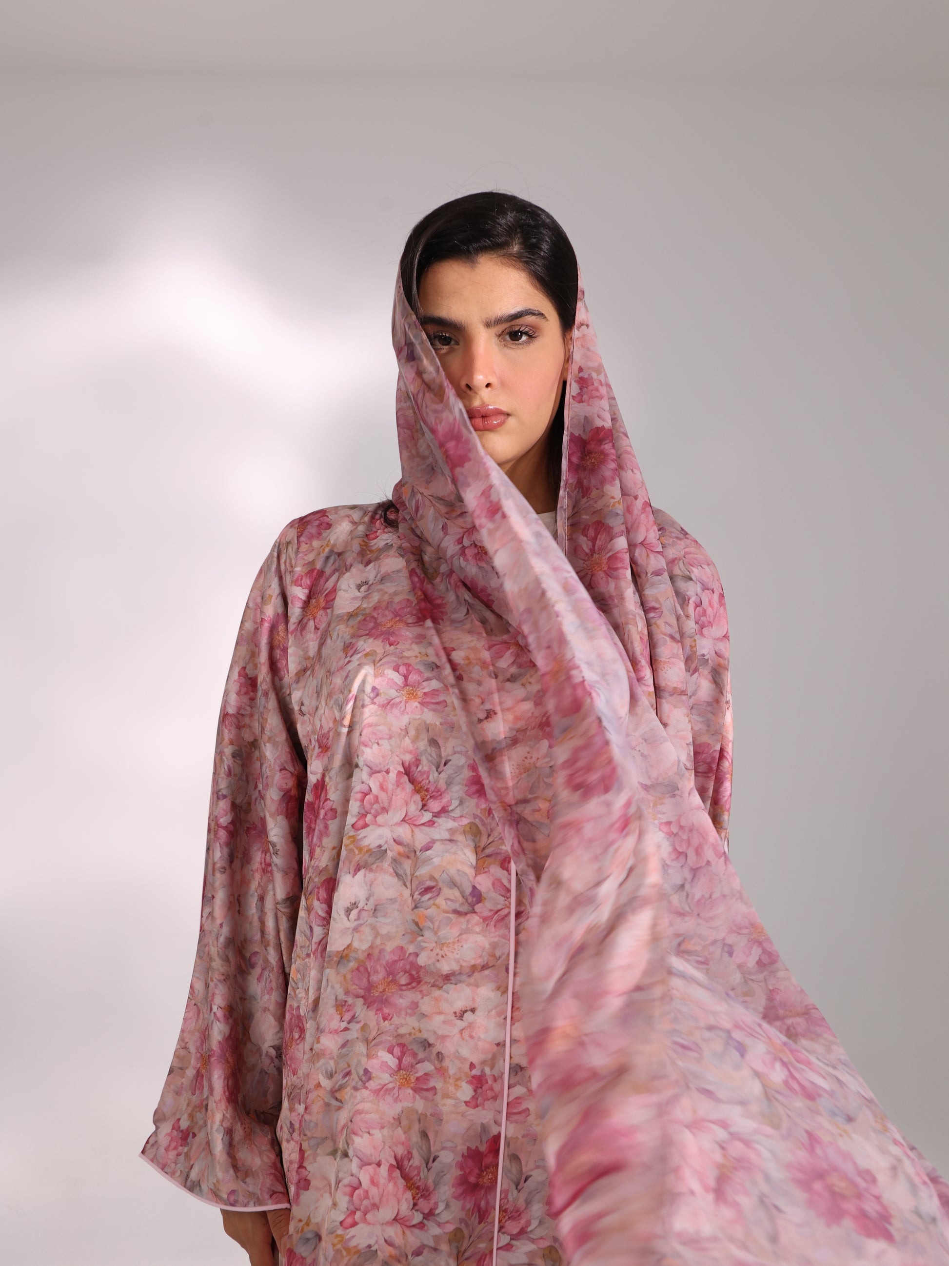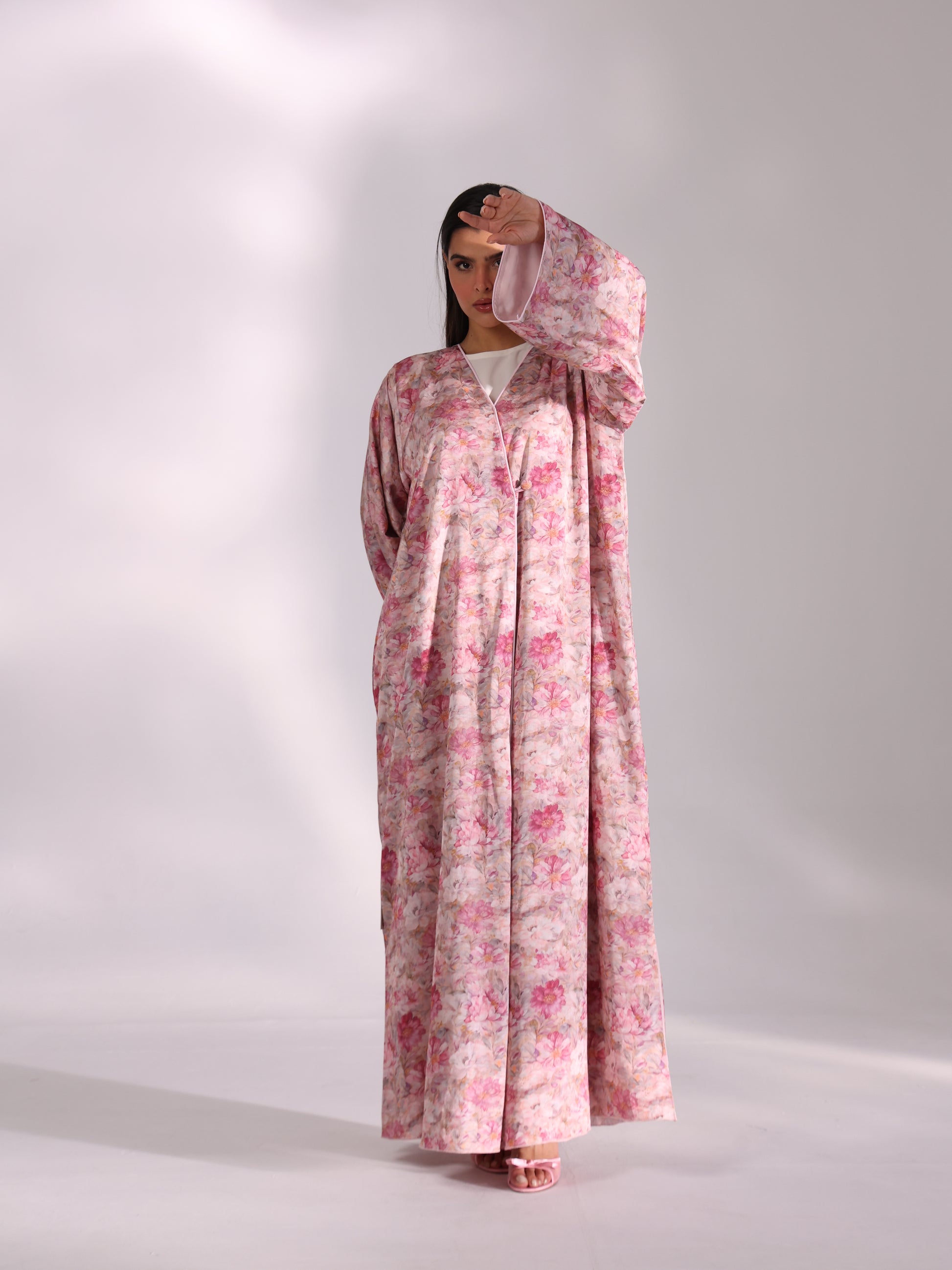 An abaya that whispers femininity, crafted in pink-toned Italian jacquard with a refined crossover cut. The integrated inner lining enhances structure and movement, giving the garment a confident presence.