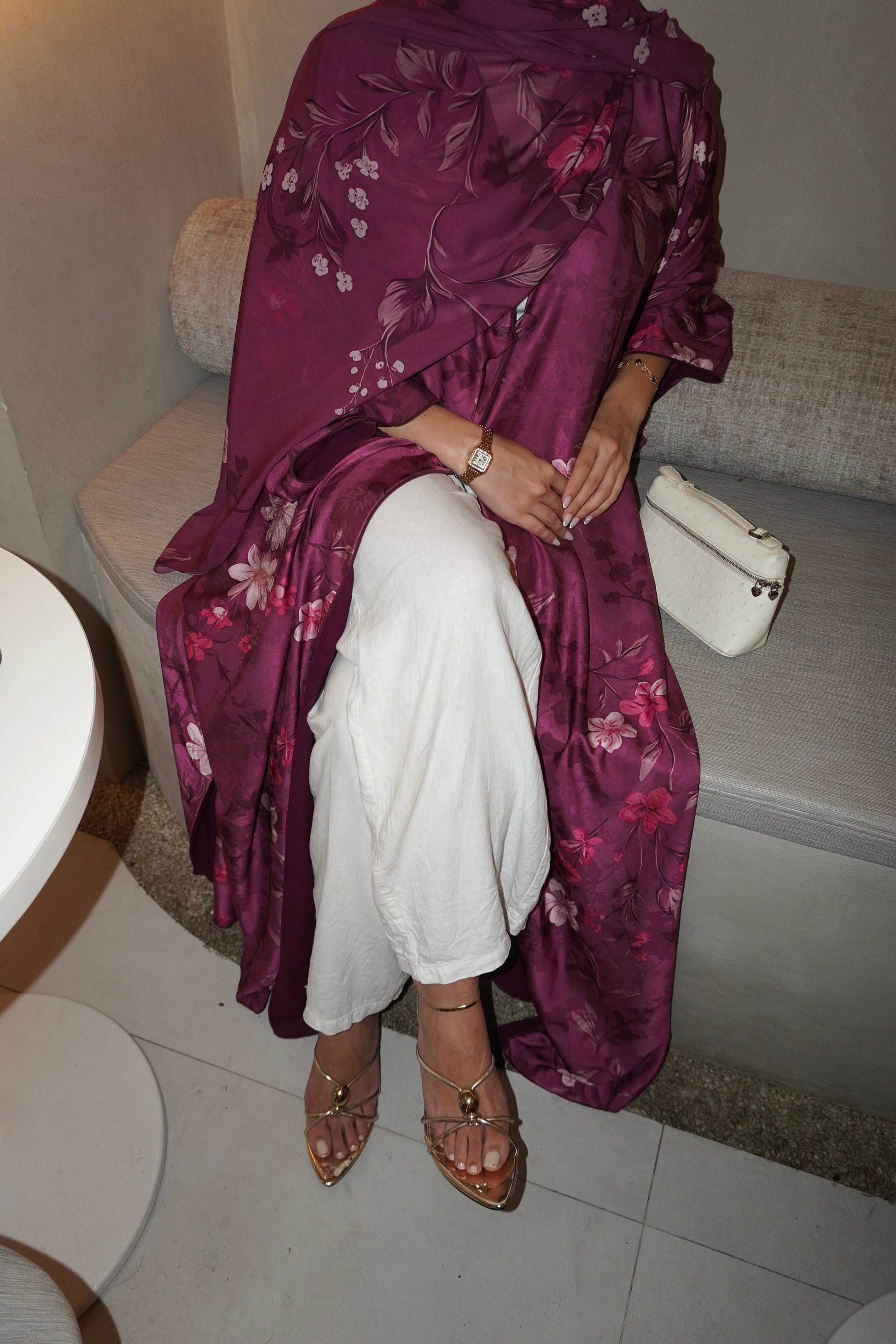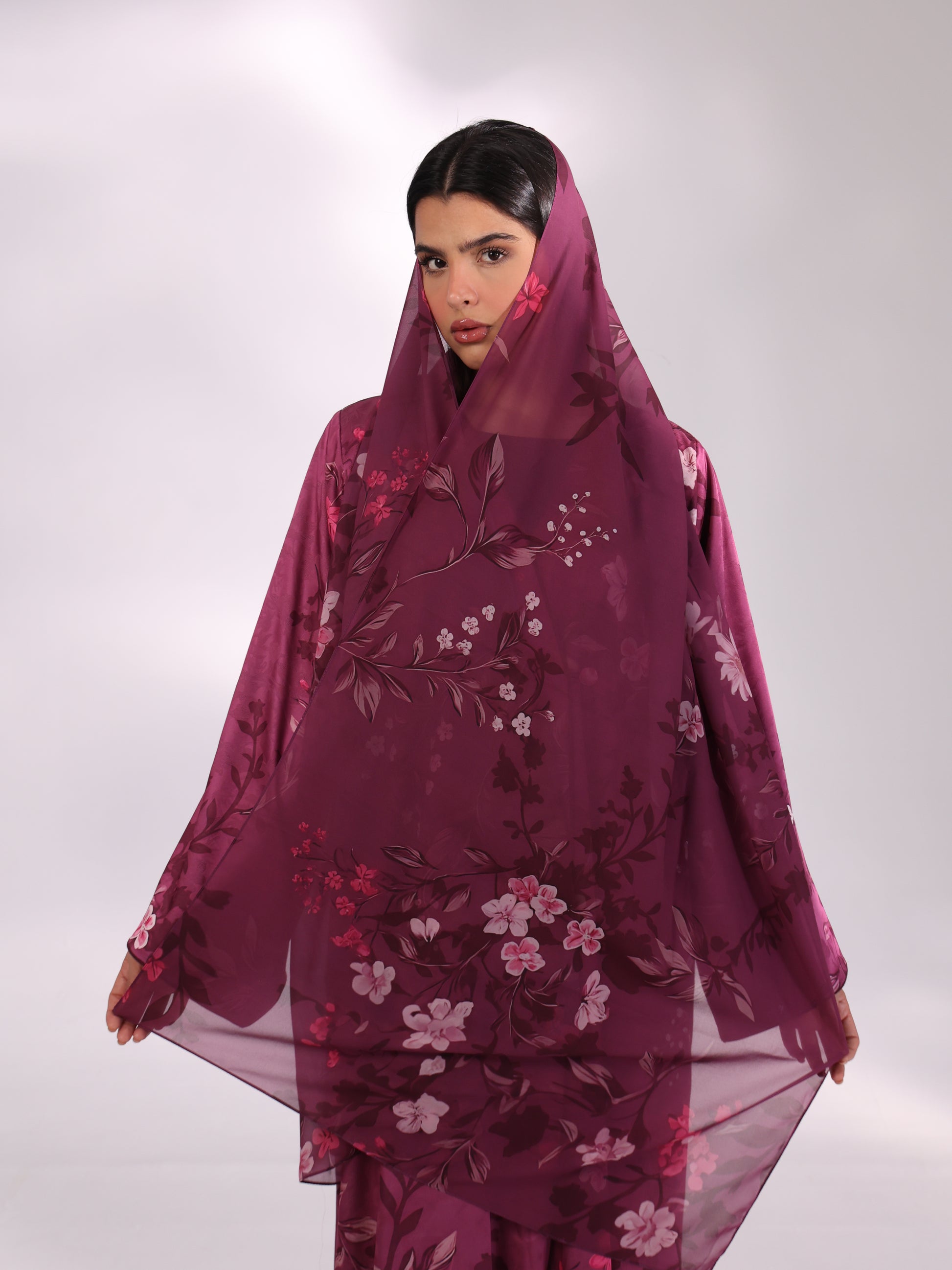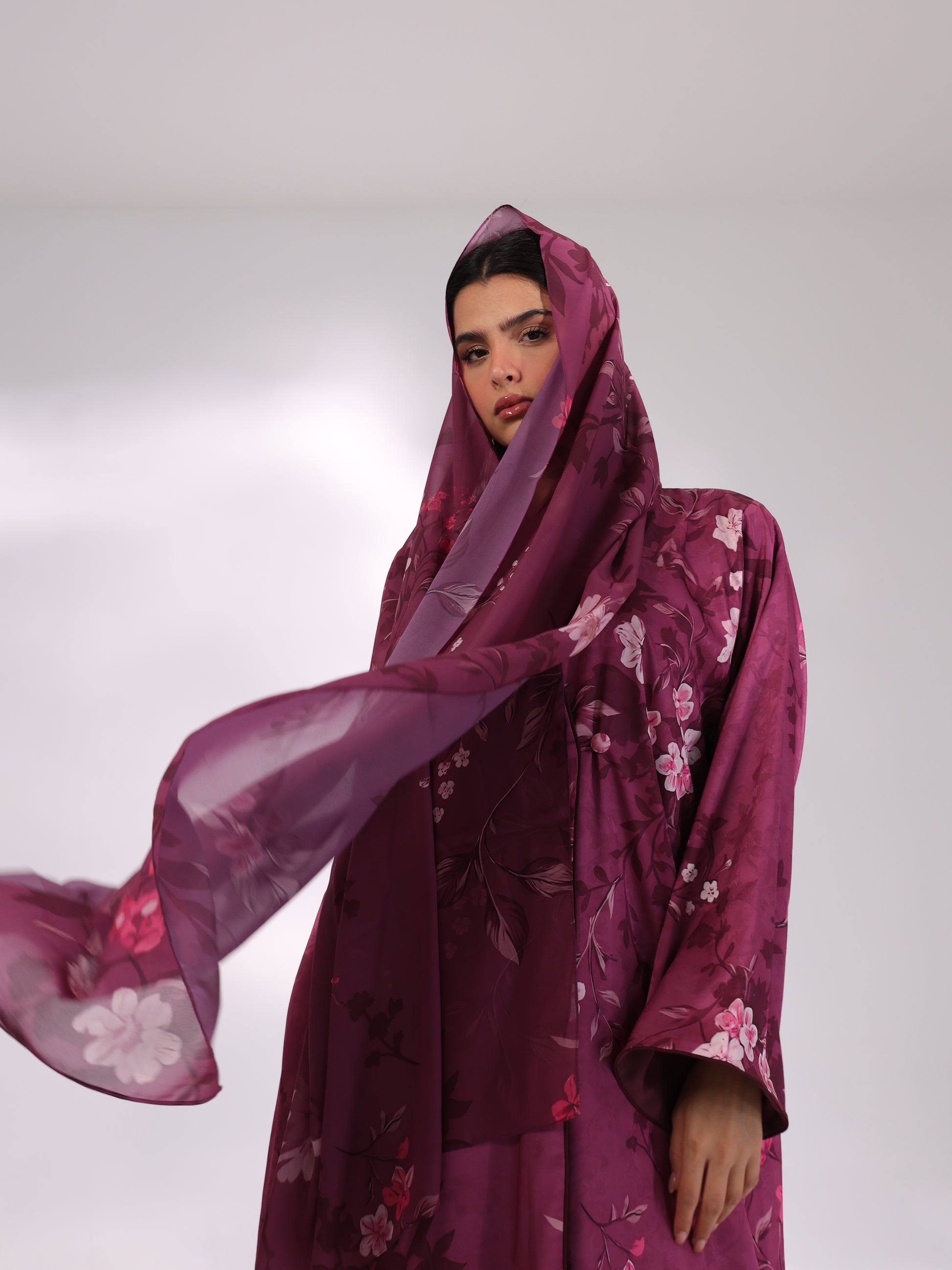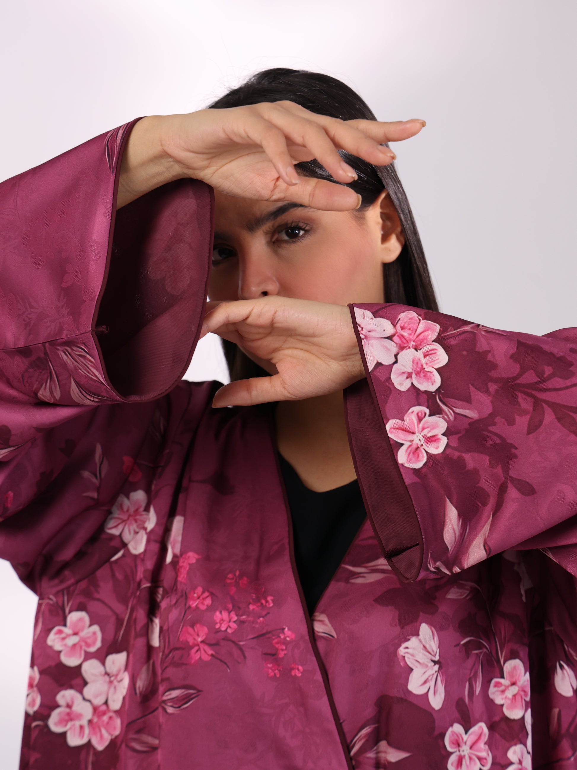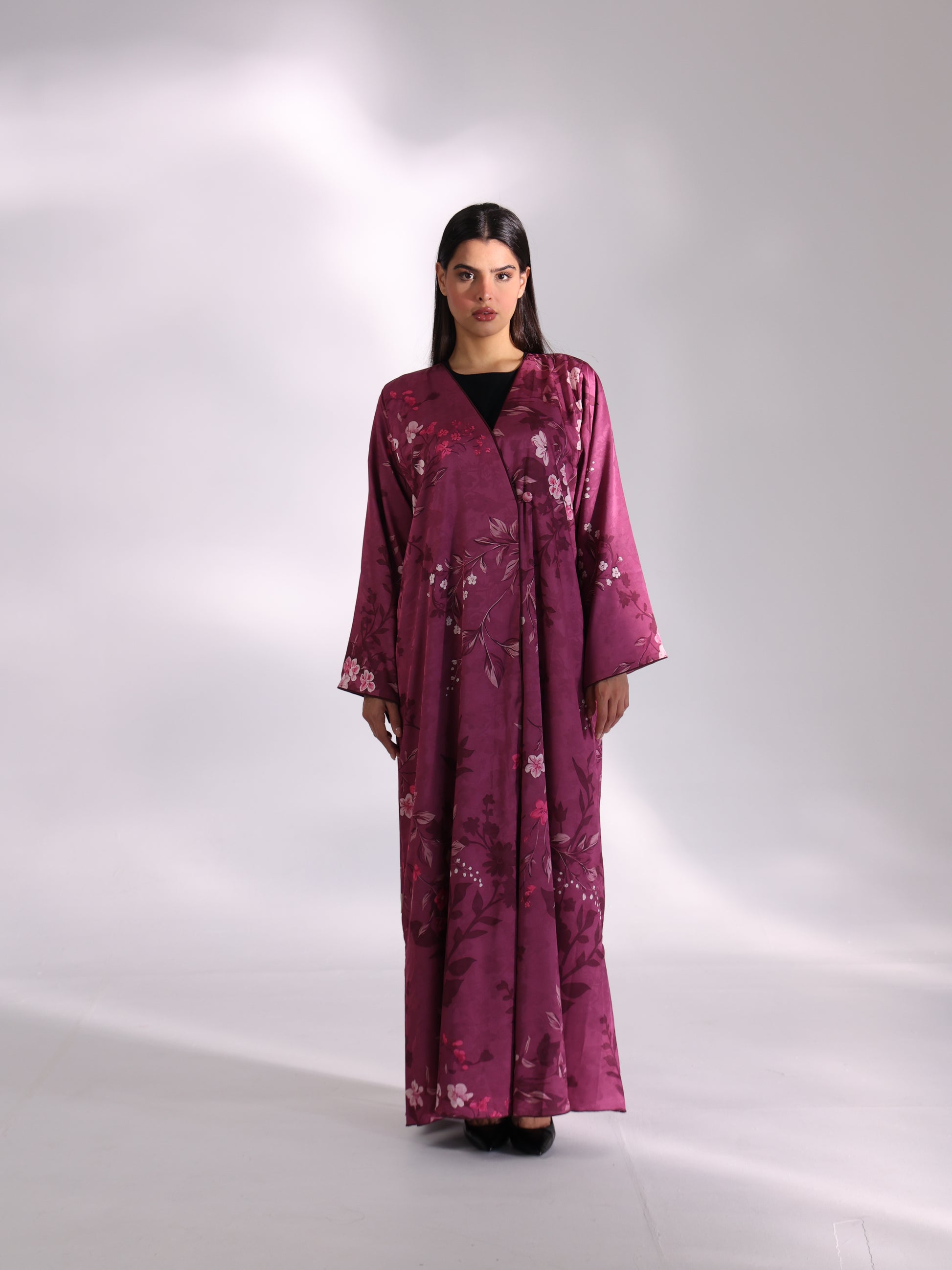 An intense raspberry-coloured abaya in Italian jacquard with an elegant crossover cut. Finished with an inner lining that enhances movement, structure, and sophisticated flow.