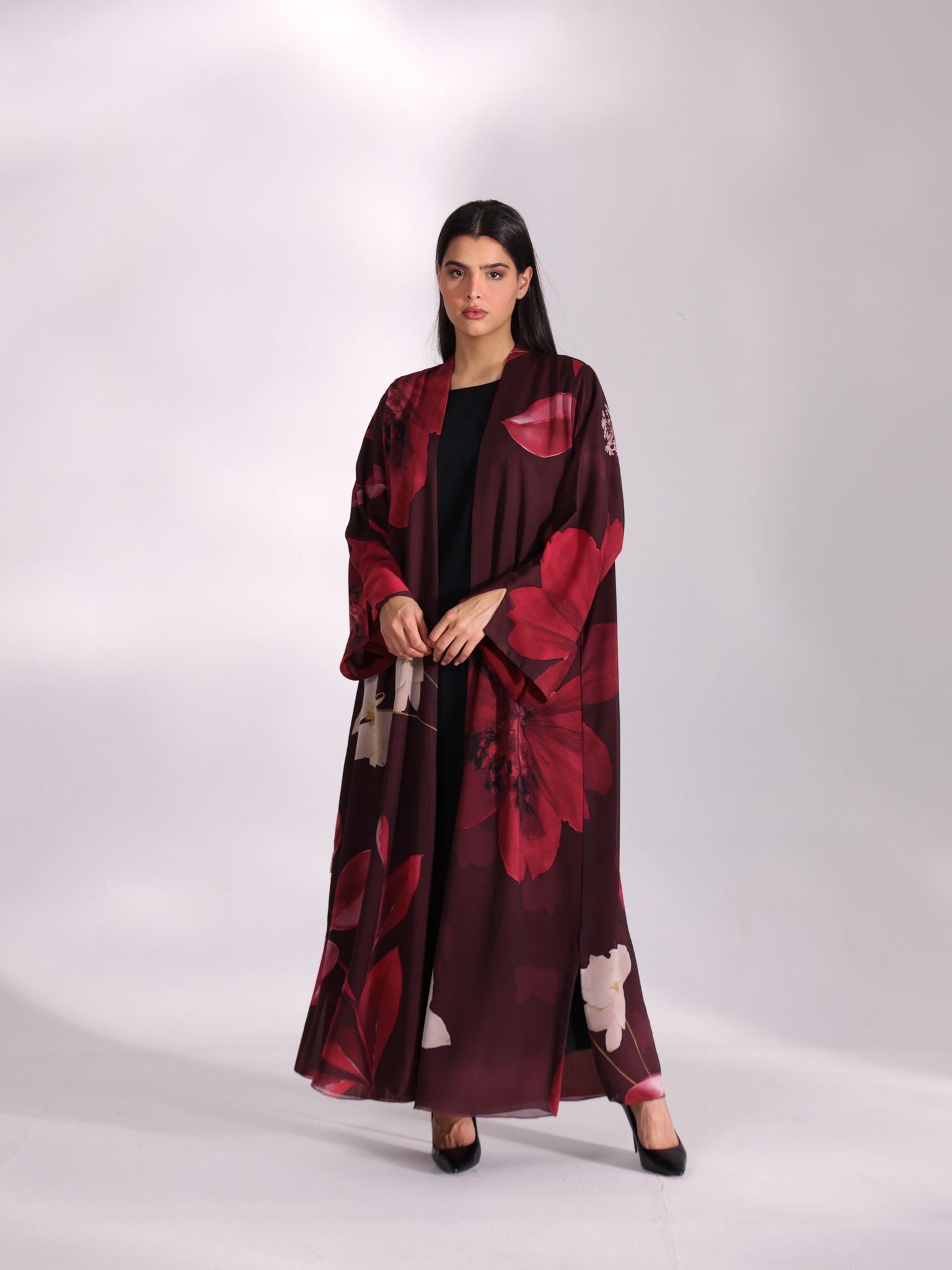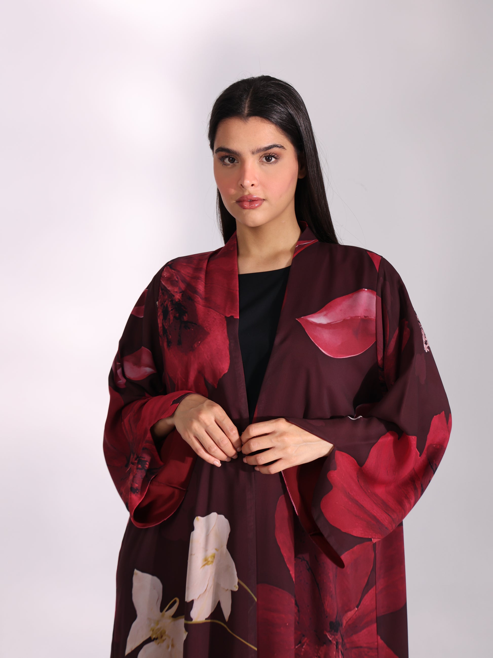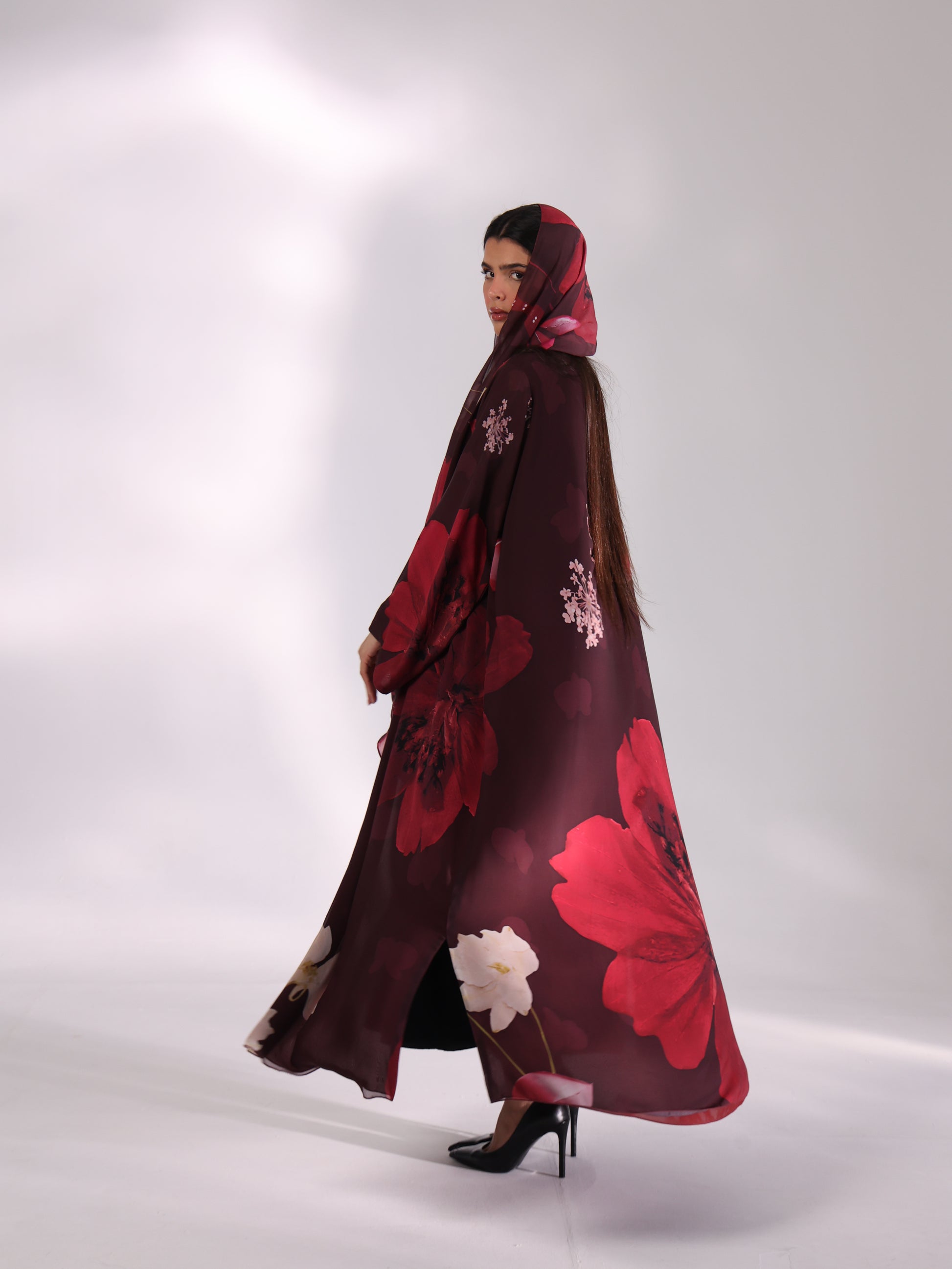 Rouge Petal is a celebration of romance and elegance. Crafted in a rich maroon shade with delicate floral details, this abaya embodies femininity, grace, and effortless sophistication.