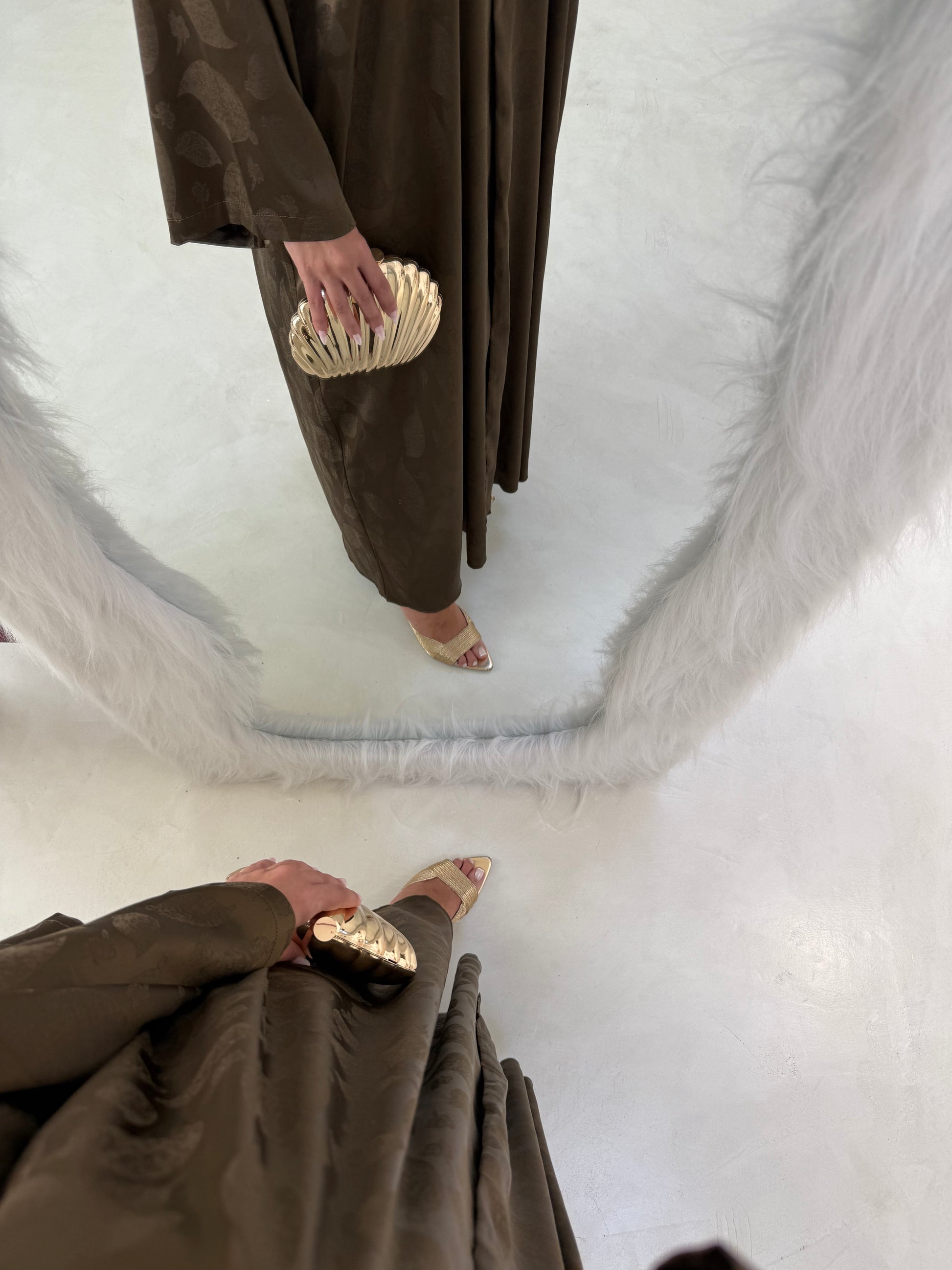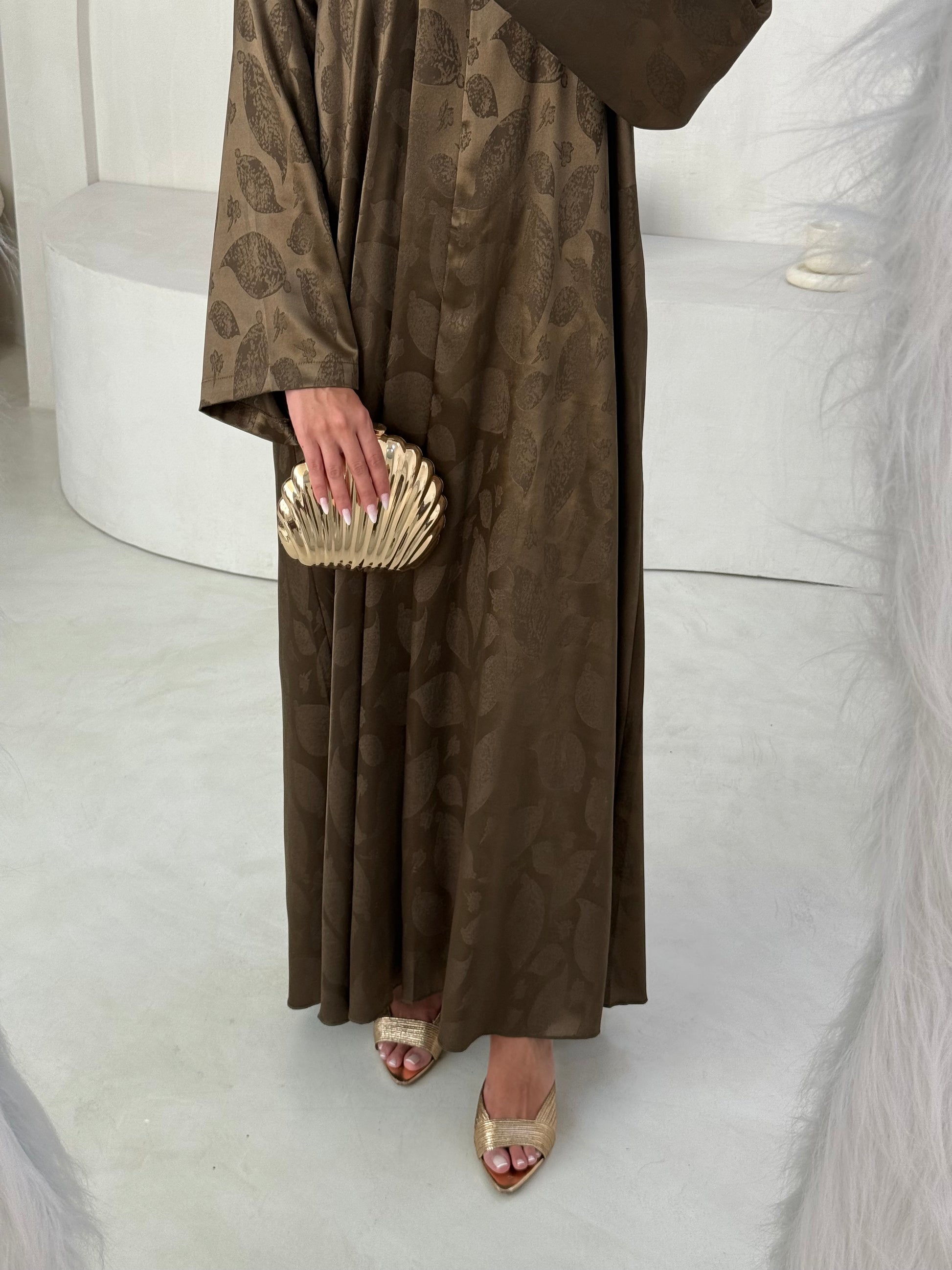In deep olive green jacquard, this abaya balances structure and fluidity.